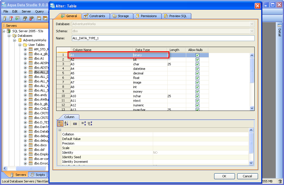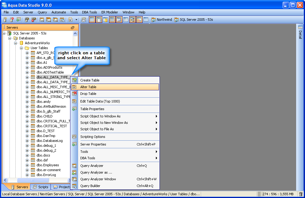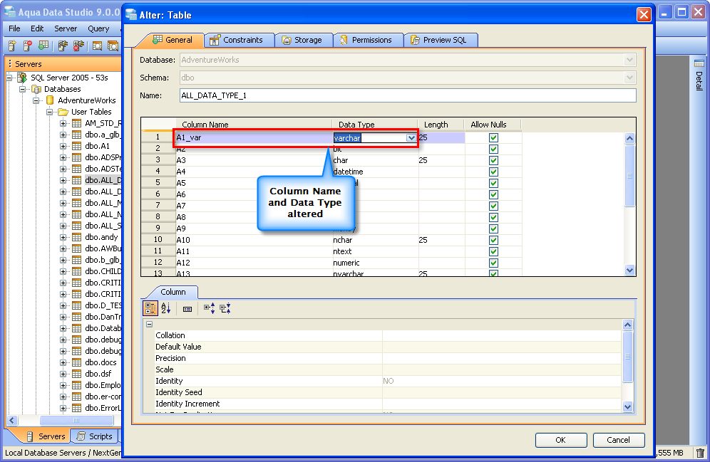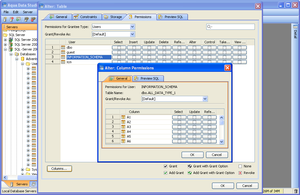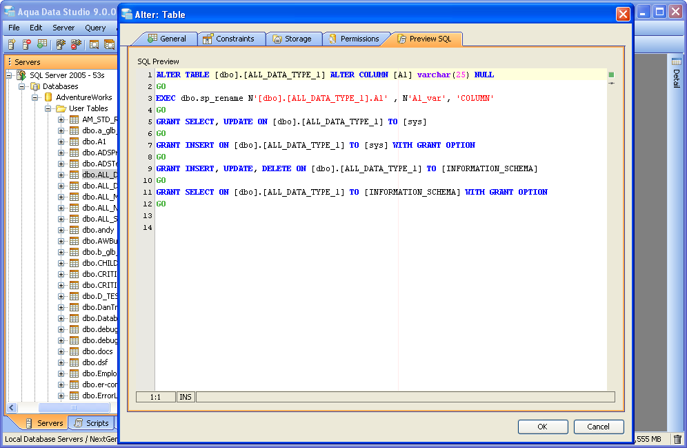 Once a table has been created, it is possible to use Aqua Data Studio's Visual Editing Tools to alter its properties. ALTER Altering tables through the GUI is also done with a right click menu on table objects in the schema browser. Right clicking on a table object opens the same popup menu as above, but to ALTER a table, select the second item in the list, "Alter Table". The resulting Alter Table window contains General, Constraints, Storage, Permissions and Preview SQL tabs across the top. Within the General tab, the table name, column names, datatypes and allow nulls can be changed. The Column information is sortable, expandable and displays more details about the selected columns. INSERT and DELETE of columns is available via right click on the Column Names within the General tab of CREATE and ALTER dialogs. The database and schema cannot be changed, and remain grayed out. Columns can be added (INSERT), deleted (DELETE) and changed (ALTER). Constraints and check conditions can be altered in the Constraints tab. Constraint properties details such as Name, Type, Ref Schema, Ref Table and Check Condition are modifiable visually. Constraint Definition Table Columns and Referenced Columns can be visually edited Storage information, just as above, can be altered in the Storage tab. The Storage tab provides details on Tablespace and table storage, its content vary depending on server vendor and version. Table Permissions (when privileges to do so have been granted to the current user in the server registration Permissions tab) can be altered and granted on the Permissions tab for column and command. Full grant options are available and all Permissions can be set by Grantee Type for Users, Groups or Roles depending on database vendor and type. Grant, Grant with Grant Option, Add Grant, Add Grant with Grant Option, and Revoke are available for SELECT, INSERT, UPDATE, DELETE across all databases. Depending on vendor supported functionality, there are other permissions which may be set such as ALTER, INDEX, References, On Commit Refresh, Query ReWrite The "Columns..." button at the bottom right of the Permissions tab, allows further permissions changes, including SELECT, INSERT, UPDATE, and References for the columns highlighted in the permissions grid within the Permissions tab. The Preview SQL tab displays the DDL used to alter the table based on the properties set within the other tabs. Below are the steps to alter a table.