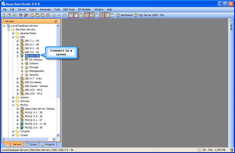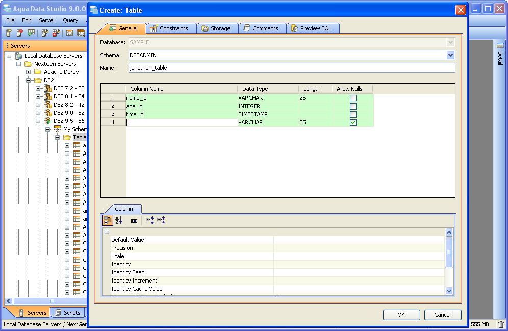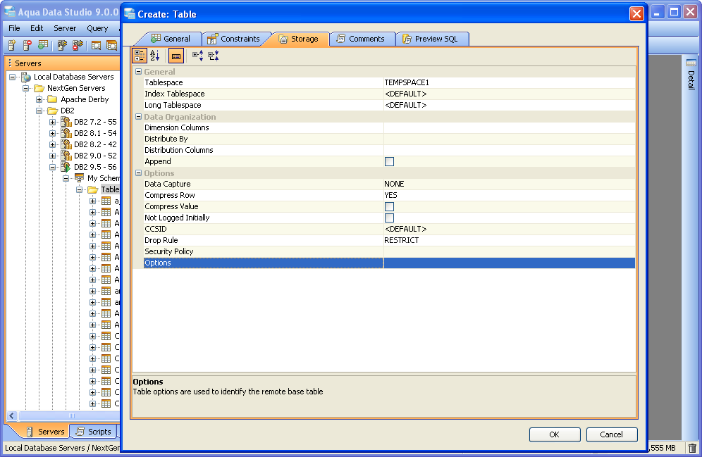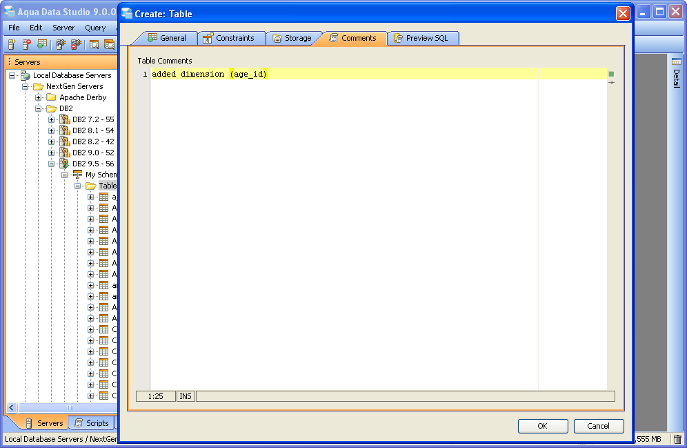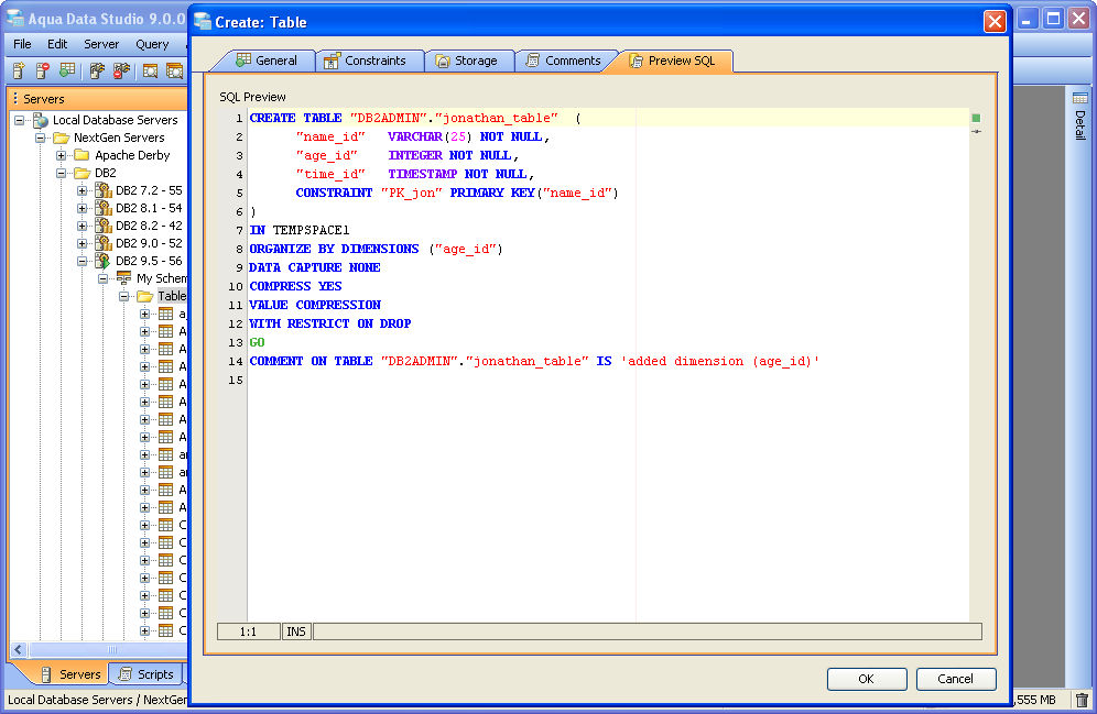 Aqua Data Studio contains GUI tools for visually editing and creating Tables. CREATE Creating tables through the GUI Tools available in the schema browser begins with opening a database server connection and expanding the tree to view the server's tables. Right clicking on the schema container for Tables generates the pop-up menu containing "Create Table" as its first item. The Create Table dialog has General, Constraints, Storage and Preview SQL tabs across the top. The General tab is where the table is named and its columns and datatypes are set. The Column information displays more details about the selected columns in the descriptin area below the column grid. INSERT and DELETE of columns is available via right click on the Column Names within the General tab of CREATE and ALTER dialogs. All of the datatypes available to the current database can be accessed with a dropdown next to the column names. The Constraints tab allows selection of columns for use in constraint creation (including Primary Key) and check conditions. Constraint properties details such as Name, Type, Ref Schema, Ref Table and Check Condition are modifiable visually. Constraint Definition Table Columns and Referenced Columns can be visually edited. For more on constraints, see the Creating Constraints page. The Storage tab provides details on Tablespace and table storage, its content vary depending on server vendor and version. The Comments tab provides space for text comments that will be stored with the table in the database. Some vendors also allow Table Column Comments, to make comments on specific columns. Where this is available, such comments will also appear ER Models containing tables with these properties. The Preview SQL tab displays the DDL used to generate the table and its properties based on the settings of the other tabs. Below are the steps used to create a table in DB2 9.5. Because other databases may not have dimensions, steps 6 and 7 may not be needed.