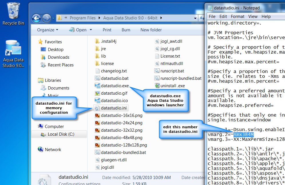 In your installation directory (default: "C:\Program Files\Aqua Data Studio") there is a file called datastudio.ini which contains JVM parameters for startup. In this file you may modify the line "vmarg.2=-Xmx384M", where ’384’ is equal to the amount of memory allocated to Aqua Data Studio. You can change this number to increase your memory to 512MB, 1024MB or larger. Once you have made your changes, restart Aqua Data Studio.