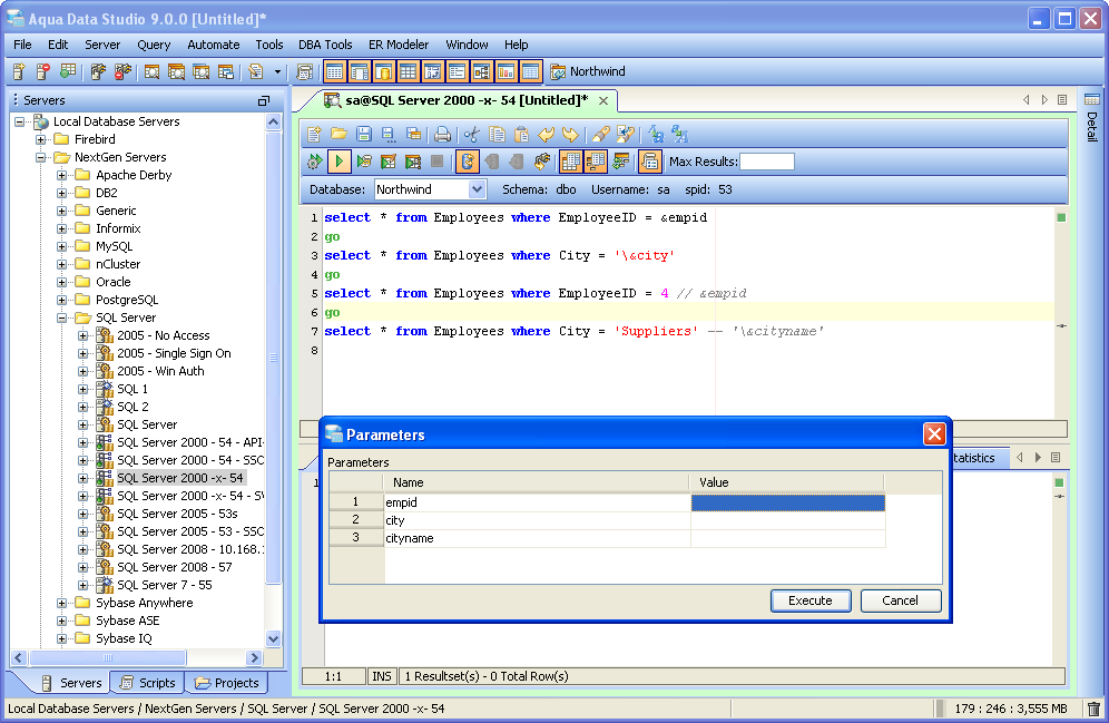 The Query Analzyer supports parameterized scripts. From the Query Analyzer Toolbar, the user may enable/disable the ability to support parameterized scripts. There is also an option to keep parameterized scripts enabled for all query analyzers based on vendor and version under File->Options->Query Analyzer. By enabling Parameterized Scripts, the user may have scripts with defined parameters so that Aqua Data Studio will prompt for the values of the parameters before executing the script. Executing a Parameterized Script
