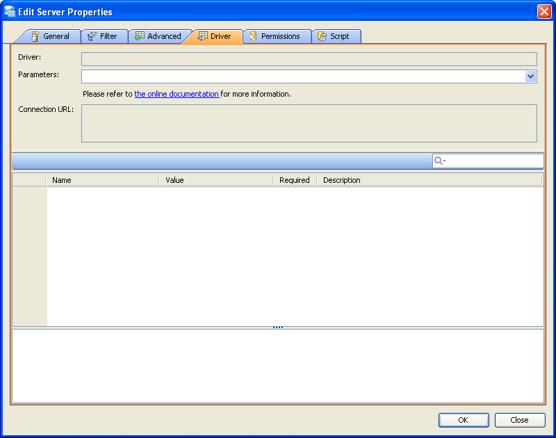 With options in Driver properties of a Server, you can edit/view the :