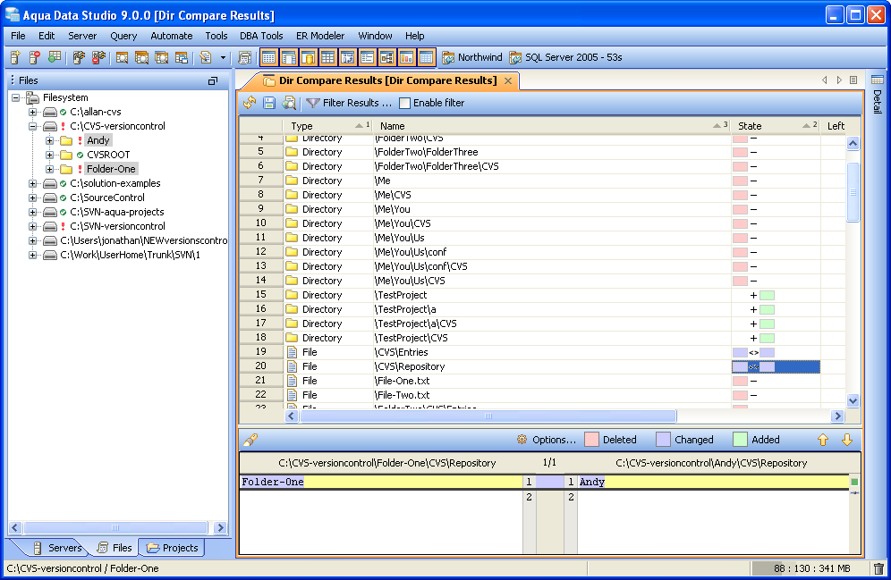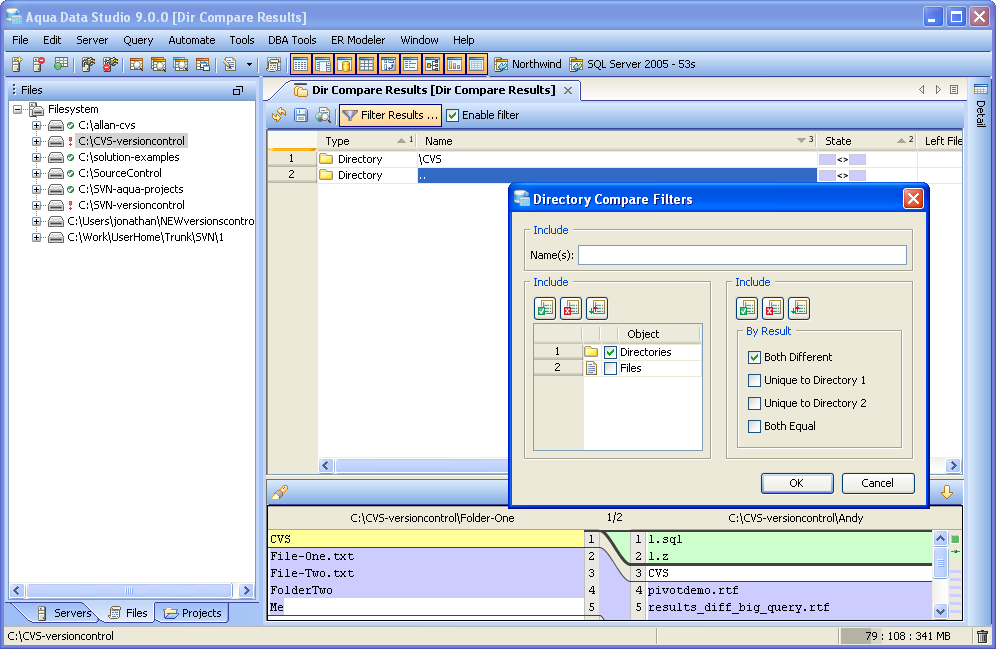 Launching the Directory Compare Tool The Directory Compare Tool provides users a method of depicting differences in the content of directories. To compare two directories, either multi-select individual directories in the Files Browser from mounted directories, or launch the Directory Compare Tool from Tools Menu (Tools->Compare->Directory Compare) and browse to them. If the Directory Compare Tool is launched from the Tools Menu, it is possible to choose directories that are not listed in the Files Browser, but are available to the operating system. It is also possible to drag items into the application from the operating and drop them off on the Directory Compare Tool selection window. Filters to exclude files by file size, name, directory, or file extension can be selected before the comparison is run using the "Show Differences" button. The Directory Compare Tool keeps the last directories selected when the application is restarted and the Directory Compare Tool is relaunched. When the comparison is being performed the status bar indicates its progress and runs in a background thread so that other operations in Aqua Data Studio can be performed. Comparison Results The results of a comparison display as a split-pane with line numbering down the center and connecting splines for identifying where the deletions, changes and additions occur. Each file in a comparison takes up half of the comparison results window and each can be vertically scrolled independently of the other. At the top, between the two files above the line numbering, digits separated by a / indicate the difference selected out of total number of differences discovered (i.e. 9/27). The large up and down arrows at the top of the comparison results allow navigating through the differences one at a time. Comparisons show the character differences in a modified line with bolding and background color highlights indicate modified blocks. The file and directory listing for a resulting comparison has columns for type, name, state, left file size, right file size and difference count. These columns can be sorted one at a time by Ctrl +click on column headers. Their position left to right can be reorganized by dragging them into new positions. When a particular item in the comparison results is selected, details about its differences are displayed in the preview panel at the bottom. If they are not identical they are highlighted by default in pink (deleted), purple (changed) or green (added). The colors for the difference highlighting can be changed with the Options button at the top right of the comparison results Preview Panel. The Search button at the top left of the comparison results Preview Panel is useful for finding and highlighting specific content in the item selected in the comparison results. Annotation Bar The annotation bar provides a bird's eye view of all of the differences detected in a comparison. When differences are found, their corresponding highlight colors appear in the annotation bar on the right side of the results and can be used to quickly navigate to them. If a marker in the annotation bar is used to navigate to a particular difference by left clicking, a tick mark overlay shows which difference currently has focus. Once the comparison is complete, it can be refreshed, allowing the same comparison to be run again. It is also possible to select two new files for comparison by clicking the "Browse" buttons at the top of the comparison results without having to launch the Compare Tools Menu again. Comparison Filters When the "Enable Filters" checkbox is checked filters can be run on the existing comparison to help locate specific differences. The "Filter Results" button launches the Filters dialog, and the checkbox next to it runs those filters on the current comparison. Object Types of directory or file can be filtered within the Filter dialog for names and wildcards. If all that is needed is a viewing of the files which are different, checking "Directories" (to exclude directories in the comparison) and checking "Both Different" will show only those files that are different in both directories. Directories or Files or both can be filtered for when: