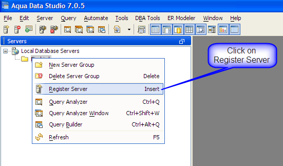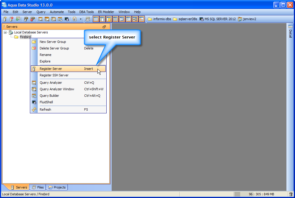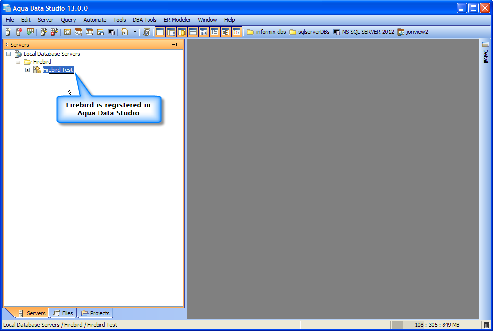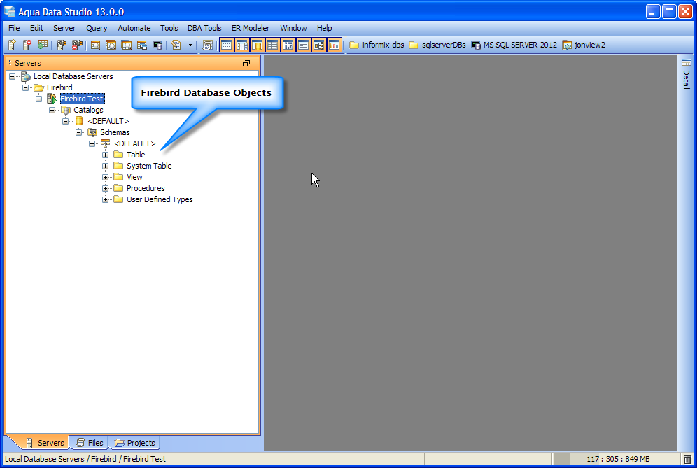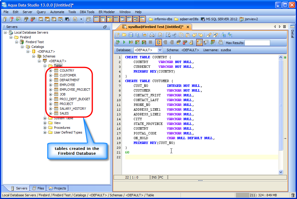 jdbc:firebirdsql:localhost/3050:C:\\pathtodatabase\\SampleDB.FDB where SampleDB is the Firebird database you want to Connect to (only windows user require paths to be formatted with escaped \, like C:\\pathtodatabase\\SampleDB.FDB ;while Linux and OSX would use /pathtodatabase/SampleDB.FDB) org.firebirdsql.jdbc.FBDriver in the Driver fieldThe Firebird Database server is registered successfully in Aqua Data Studio. You can now connect to the newly registered Server and perform Data Manipulations