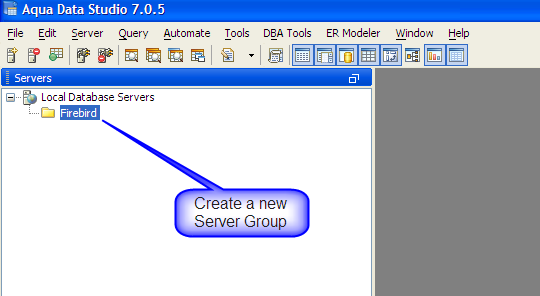 | Create Server Group | Register a FirebirdServer | Enter Properties | Locate Firebird Driver |