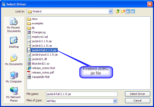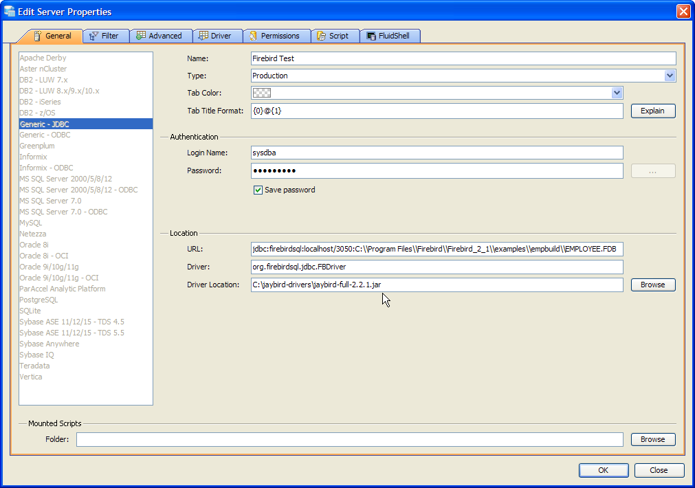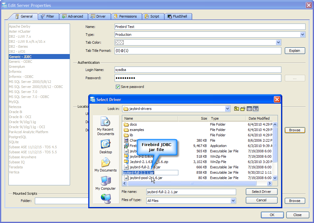 JDBC Drivers for Firebird must be downloaded from the vendor and are not bundled within Aqua Data Studio. Each registered Firebird server in Aqua Data Studio requires the use of the Generic JDBC connection type and the jaybird-full-x.x.x.jar Firebird JDBC driver that is written for the version of Firebird you have installed.