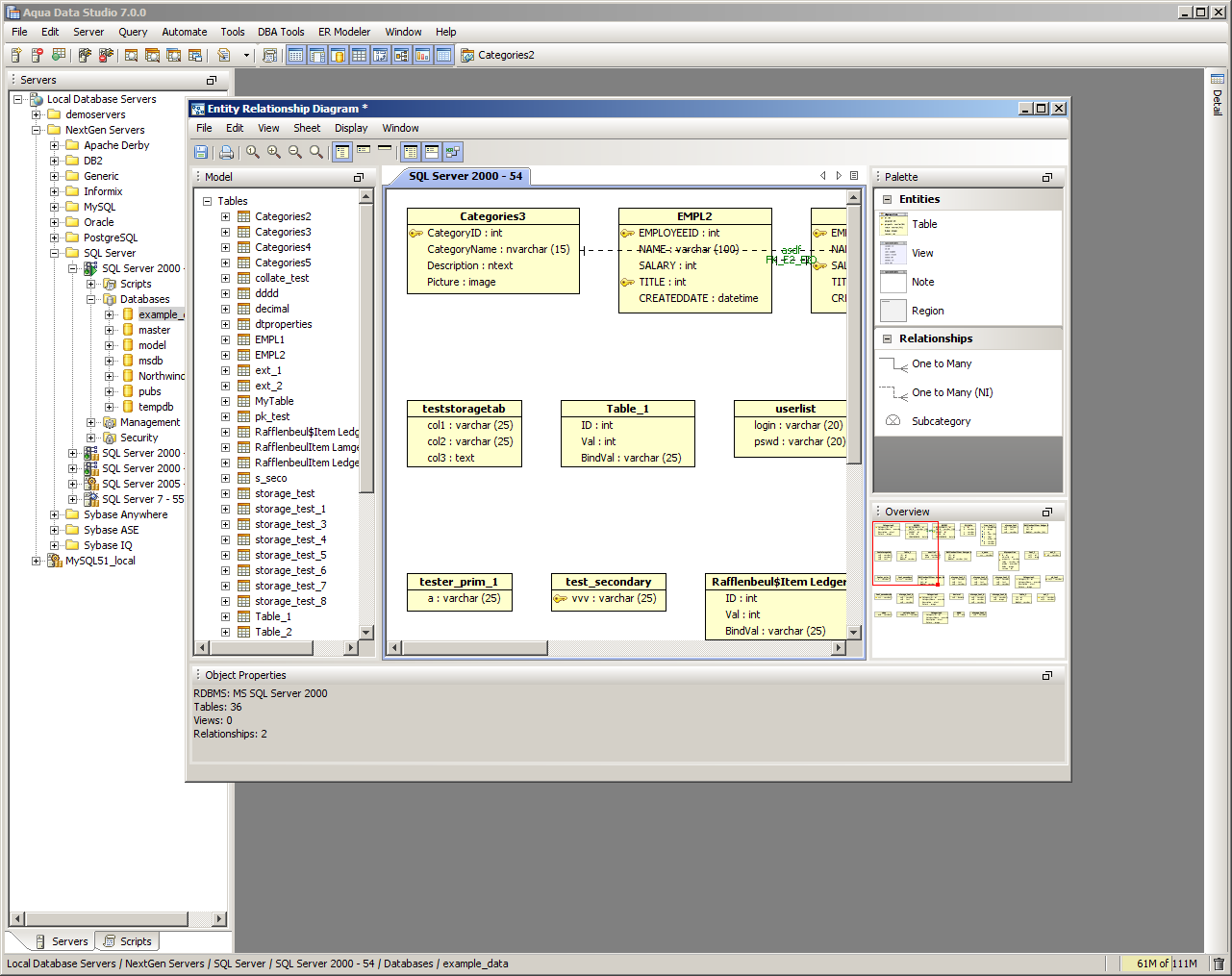 The Entity Relationship (ER) Diagram Generator helps users achieve a better understanding of their database schema by displaying the structure in a graphical format. The ER Diagram Generator uses the fully-featured Entity Relationship (ER) Modeler to create saveable, editable and exportable .xed diagrams that can be shared as part of a version control repository. See the full documentation on the Entity Relationship Modeler here for more on how to forward and reverse engineer database, migrate database and export for ERWin and Visio. Below are instructions on how to launch the ER Diagram Generator from the Main Appliction Menubar and the Schema Browser. 1. Launch the ER Diagram Generator dialog by Selecting ER Modeler->Generate from the Menu Bar or Selecting Tools->ER Diagram Generator from the right-click pop-up menu on a database object in the Schema Browser. 2. In the ER Diagram Generator dialog select a Database and Schema (or All Schemas). In the left panel, select one or more of the Object Types to be diagramed (Tables, Views or Both). Click the green check button to select all and the red X button to deselect all. All objects matching the selected schema and object types will appear in the right panel. Select one or more objects to be diagramed 3. Click Next to generate the diagram. The Status Tab will display with information on the diagram's creation including elapsed time, time remaining and number of objects diagrammed. Once the diagram is generated, the ER Modeler will open and display the new diagram. All of the table entity objects created can be edited, repositioned and exported. See the ER Modeler section for the full details on its capabilities and features. |
