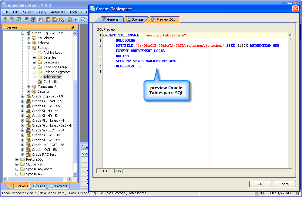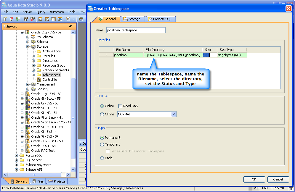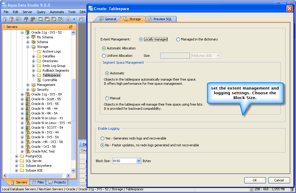 To create Oracle Tablespaces, connect to an Oracle server and expand the tree to view the Storage container. Right click on Tablespaces within the Storage container and select create Tablespace. Enter Tablespace Settings for Datafile name, file directory location, Status and Type. In the Storage Tab, set the properties for Extent Management (Automatic or Uniform Allocation), Segment Space Management (Automatic or Manual), and Logging. Adjust the Block Size as needed. Preview the SQL in the Preview SQL tab. Click OK to finish.