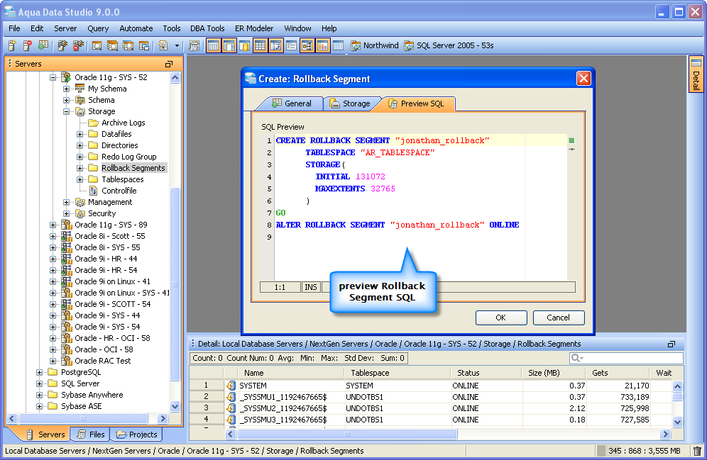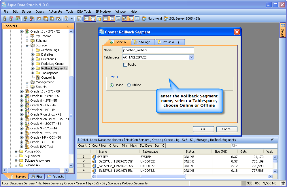To create Oracle Rollback Segments, connect to an Oracle server and expand the tree to view the Storage container. Right click on Rollback Segments within the Storage container and select Create Rollback Segement. Enter the Rollback Segment name and Tablespace. Select its status as Online or Offline. In the Storage tab Set the Extents Initial Size, Next Size, Optimal Size, Minimum Number and Maximum number. View the SQL in the Preview SQL tab. Click OK to finish.