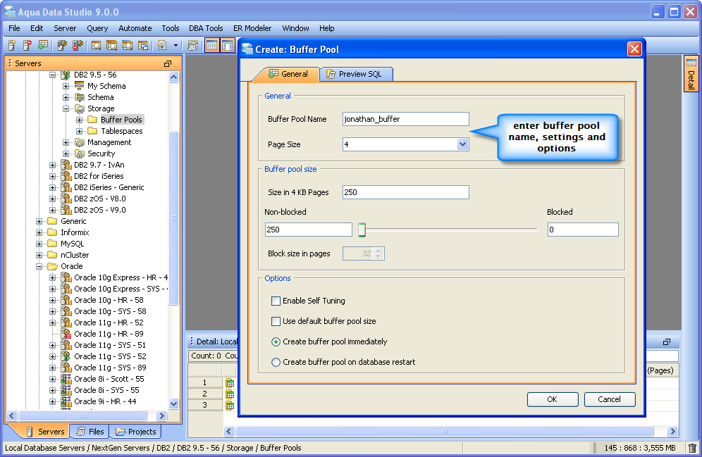 To create a DB2 Buffer Pool, expand the DB2 Storage container and right click on Buffer Pools to select Create Buffer Pool. Enter a Buffer Pool name and select a page size. Under the Buffer Pool Size section, select the size and the number of Non-blocked and Blocked Pages. Select the Block size in pages. Under the Options section choose Self Tuning or Use default Buffer Pool size. Select Create Buffer Pool on database restart or Create Buffer Pool immediately. Preview the SQL in the SQL Preview tab. Click OK to finish.