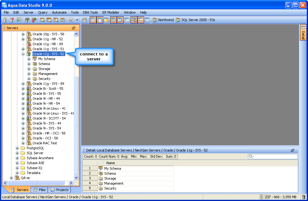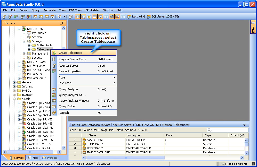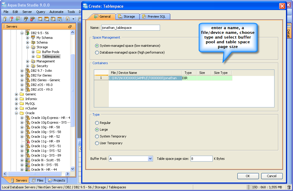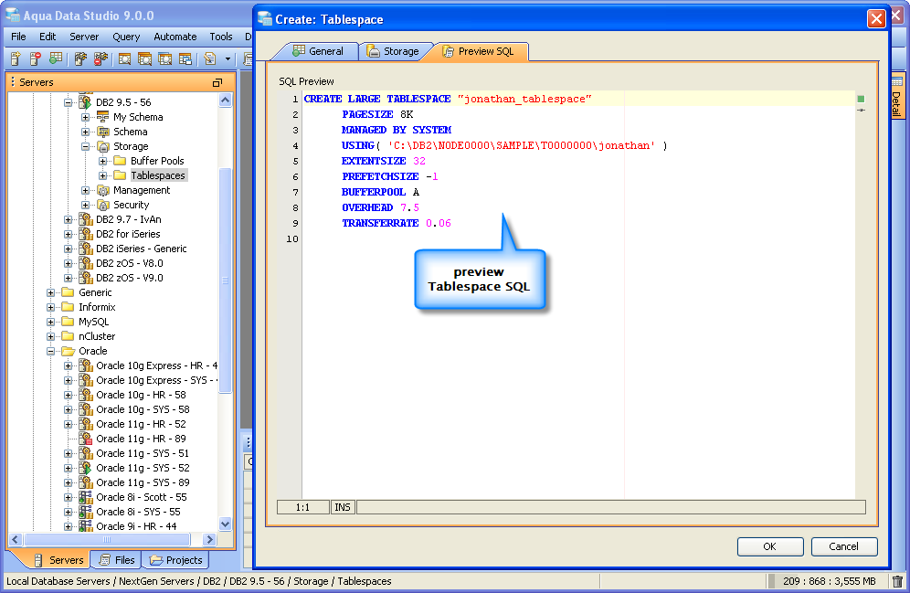 Aqua Data Studio provides visual editors for creating database Storage objects. By navigating the schema browser you may locate the Storage container (a hard drive shaped icon) underneath server connections. Storage objects vary based on database vendor and version.