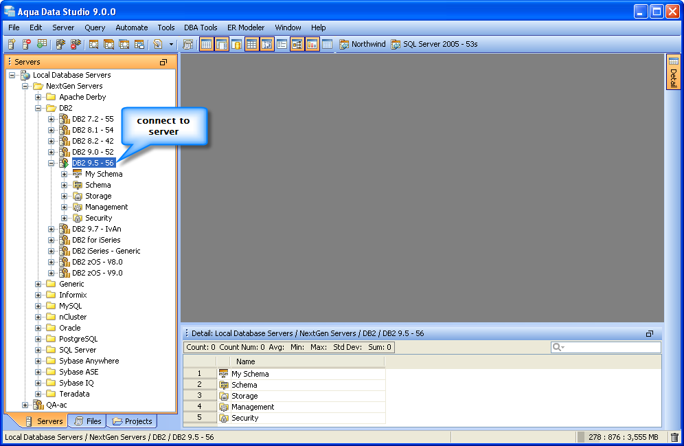 To create a DB2 Tablesplace, expand the DB2 Storage container and right click on Tablespaces to select Create Tablespace. Give the Tablespace a name, enter the path to the container and select the Type. Select the Buffer Pool to use and give the tablespace page size. Under the Storage Tab give the Extent Size, Prefetch Size and set the Overhead and Transfer rate in miliseconds. Preview the SQL in the SQL Preview tab. Click OK to finish.