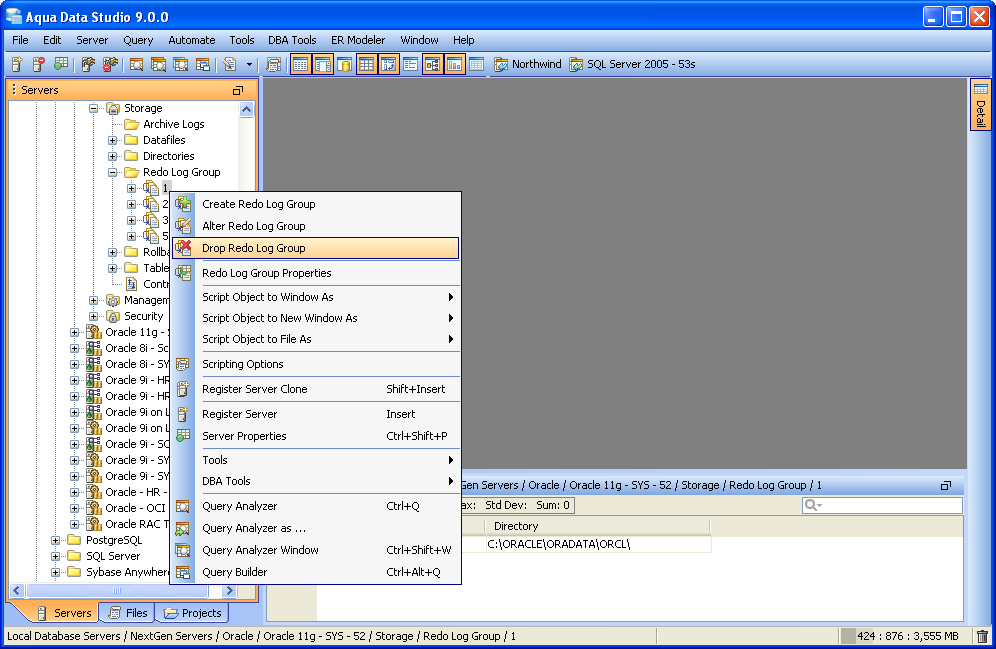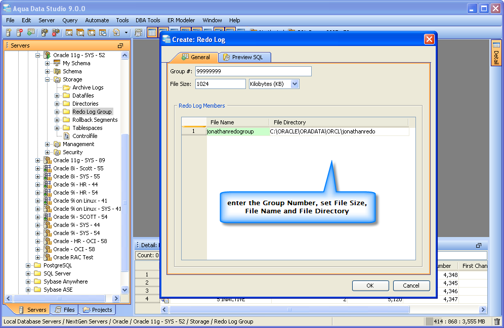 To create Oracle Redo Log Group, connect to a serverand expand the tree to view the Storage container. Right Click on Redo Log Group within the Storage container and select Create Redo Log. Enter the name for the Log Number, set the filesize and name the file and its directory. View the SQL in the Preview SQL tab. Click OK to finish.