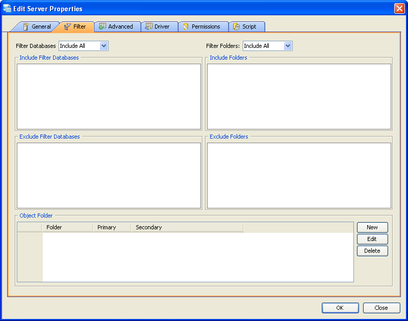 Edit the Server Properties, to use FILTER options for a Server in Aqua Data Studio: