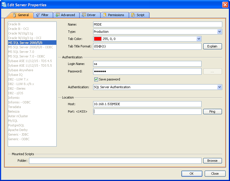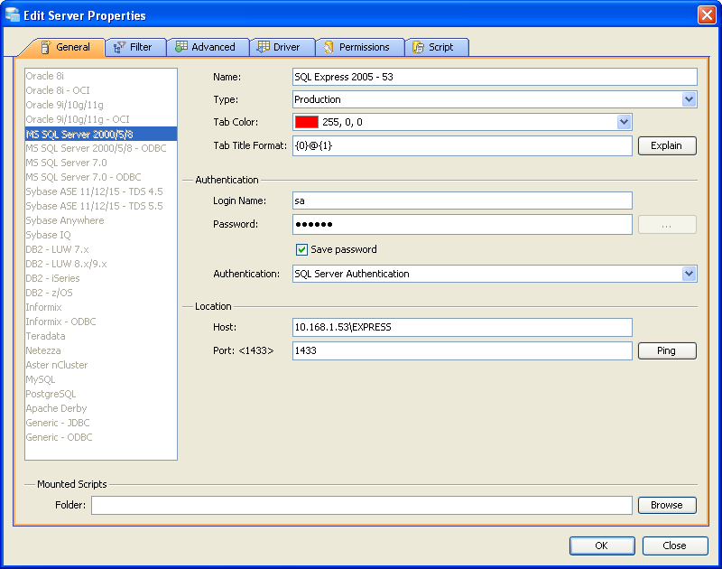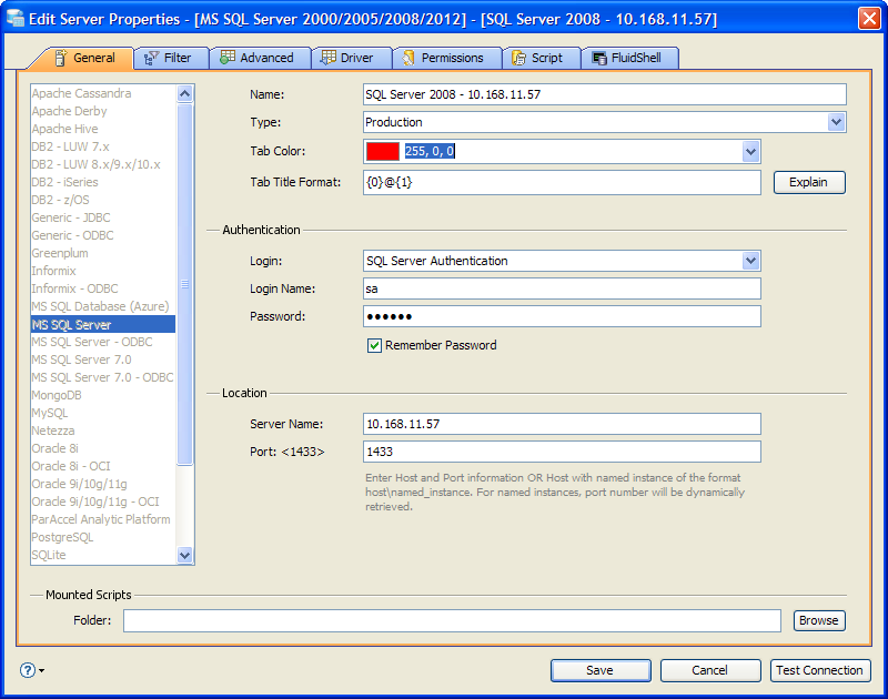 Edit Scripts in Server Properties in Aqua Data Studio: