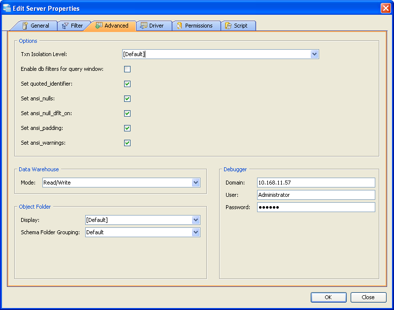 Edit the Permissions in Server Properties in Aqua Data Studio: