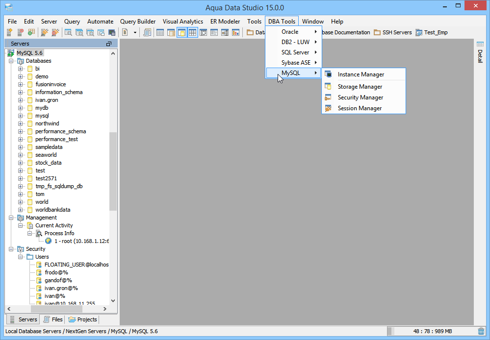 MySQL Database Administration (DBA) Tools - The MySQL Database Administration (DBA) Tools provide users with the tools to administer, manage and monitor all aspects of a MySQL database. The tools may be accessed from the application DBA Tools menu or from the schema browsers context sensitive popup menu. The following is a list of tools provided with a description of each tools functionality.