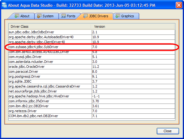 Aqua Data Studio comes bundled with the Sybase jConnect 7.0 JDBC drivers. These drivers are compatible with all Sybase IQ versions 12.5 - 15.4. It is also possible to use the Sybase iAnywhere drivers by following the steps below for Downloading and using Sybase iAnywhere JDBC Drivers.