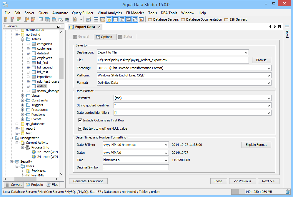 The Export Tool allows data from databases, tables and other database objects to be exported in a variety of formats. The following steps describe how to export data. Export will not work for Generic JDBC or Generic ODBC connections 1. Select Tools->Export Data from the Menubar. Choose a server from which to export data. Select the server, navigate the database and schema objects, and click ok. This will bring up the Export dialog. It is also possible to right click on items in the Schema Browser and select Tools->Export Data. 2. The first tab in the Export Data Dialog is the General Tab. In this section, specify the source of the data to be exported. The first option is to specify a table to export which will export the contents of the table. The next choice is to specify a SELECT statement of which the results will be exported. If the SELECT statement is chosen, then select a database in the database combo box in which the SELECT statement will be executed. Click Next to select Export Options. 3. In the Options Tab, browse and select a file location in which to save the exported data. Specify the encoding and platform into which the file will be saved. One of two formats may be specified: delimited data or Insert statements. When Delimited Data is specified, choose the delimiter, quote identifier, NULL value and whether to include the column names as the first of the export. Choosing the INSERT statement format allows executing the export later in the Query Analyzer. Indicate the Data Quote Identifier for parsing quotes within the data. Click Next to begin the Export. 4. The Status Tab displays Export progress and any errors or warnings in the message text window as the Export proceeds. Clicking the Cancel button halts the export. Exports stream data directly to disk and it is highly recommended that Export or "Save Result" be used instead of copying large amounts of data from a Grid Result. Using the Operating System's clipboard for a large copy effectively doubles the amount of RAM in use because the Grid Result is already holding those items in memory. Exporting to a file uses much less RAM, as a file is streamed to disk instead of being kept whole in memory. Date and time formats are specified by date and time pattern strings. Within date and time pattern strings, unquoted letters from ’A’ to ’Z’ and from ’a’ to ’z’ are interpreted as pattern letters representing the components of a date or time string. Text can be quoted using single quotes (’) to avoid interpretation. "’’" represents a single quote. All other characters are not interpreted; they are simply copied into the output string during formatting, or they are matched against the input string during parsing. It is possible to create a custom date, time and date/time format within File -> Options -> General [Appearance].
