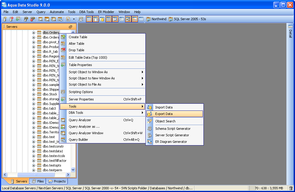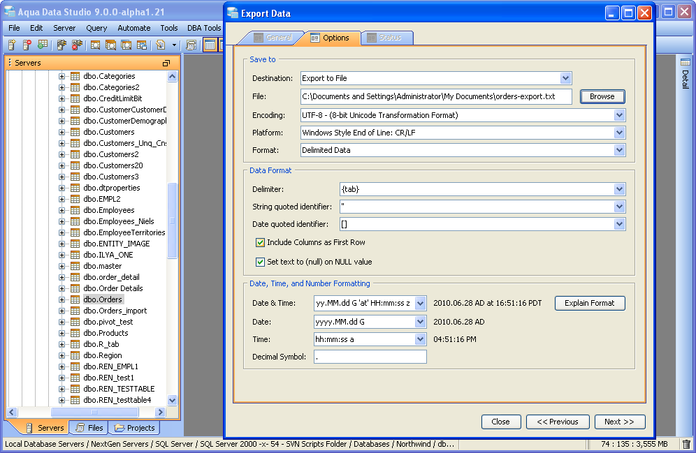 The Export Tool allows data from databases, tables and other database objects to be exported in a variety of formats. The following steps describe how to export data. Export will not work for Generic JDBC or Generic ODBC connections 1. Select Tools->Export Data from the Menubar. Choose a server from which to export data. Select the server, navigate the database and schema objects, and click ok. This will bring up the Export dialog. It is also possible to right click on items in the Schema Browser and select Tools->Export Data. 2. The first tab in the Export Data Dialog is the General Tab. In this section, specify the source of the data to be exported. The first option is to specify a table to export which will export the contents of the table. The next choice is to specify a SELECT statement of which the results will be exported. If the SELECT statement is chosen, then select a database in the database combo box in which the SELECT statement will be executed. Click Next to select Export Options. 3. In the Options Tab, browse and select a file location in which to save the exported data. Specify the encoding and platform into which the file will be saved. One of two formats may be specified: delimited data or Insert statements. When Delimited Data is specified, choose the delimiter, quote identifier, NULL value and whether to include the column names as the first of the export. Choosing the INSERT statement format allows executing the export later in the Query Analyzer. Indicate the Data Quote Identifier for parsing quotes within the data. Click Next to begin the Export. 4. The Status Tab displays Export progress and any errors or warnings in the message text window as the Export proceeds. Clicking the Cancel button halts the export. Exports stream data directly to disk and it is highly recommended that Export or "Save Result" be used instead of copying large amounts of data from a Grid Result. Using the Operating System's clipboard for a large copy effectively doubles the amount of RAM in use because the Grid Result is already holding those items in memory. Exporting to a file uses much less RAM, as a file is streamed to disk instead of being kept whole in memory. Date and time formats are specified by date and time pattern strings. Within date and time pattern strings, unquoted letters from ’A’ to ’Z’ and from ’a’ to ’z’ are interpreted as pattern letters representing the components of a date or time string. Text can be quoted using single quotes (’) to avoid interpretation. "’’" represents a single quote. All other characters are not interpreted; they are simply copied into the output string during formatting, or they are matched against the input string during parsing. It is possible to create a custom date, time and date/time format within File -> Options -> General [Appearance].