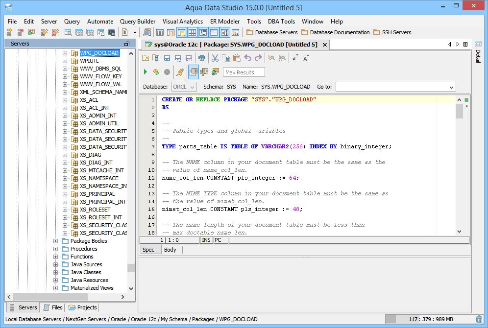Aqua Data Studio can access and edit Procedures, Functions and Packages through the Schema Browser. Stored Procedures are subroutines stored in a database's dictionary and are often used for data validation and access control. They collect logic usually spread across several statements in complex actions for access from a single call. Functions are blocks of code to perform a series of actions used to extend the functionality of a database server. User defined functions are defined with CREATE FUNCTION in SQL statements. They can be used for converting and evaluating data or performing other actions. Packages, in Oracle, are used for encapsulating a group of functions, procedures and other program objects. Packages have specifications (definitions) and bodies. They provide containers for related items. Depending on the database version and vendor, Package, Procedure and Function debugging is also available. See the SQL Debuggers section for more. When Procedures, Functions and Packages are invalid, they are marked in the Schema Browser with a red box icon overlay. Expanding marked objects in the Schema Tree shows which specific Package contents are invalid. Options for determining if both the header and the body are both compiled when compile is executed can be set in File -> Options -> Procedure Editor.