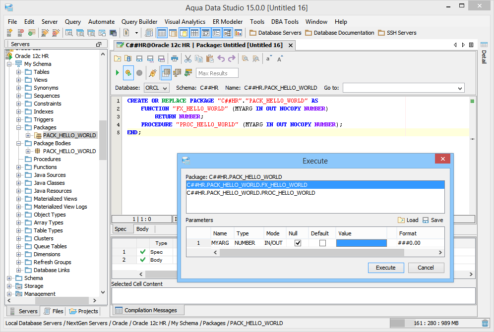 Aqua Data Studio’s PL/SQL and Function editor offers the user a compilation and execution environment for the development of functions. Compile - Compiles the function, logs any compilation messages in the result grid below it. To jump to the source of a compilation error, double-click on the line in the Compilation Messages grid. Options for determining if both the header and the body are both compiled when compile is executed can be set in File -> Options -> Procedure Editor. Execute Function - Displays the Execute Function dialog to let the user specify parameters before execution. To set a value, simply click on the parameter’s Value cell and enter a value. To execute, click the Execute button or click the Cancel button to abort execution. When Packages, Functions or Procedures are Invalid, a red invalid indicator appears in the Schema Browser tree over the object's icon.