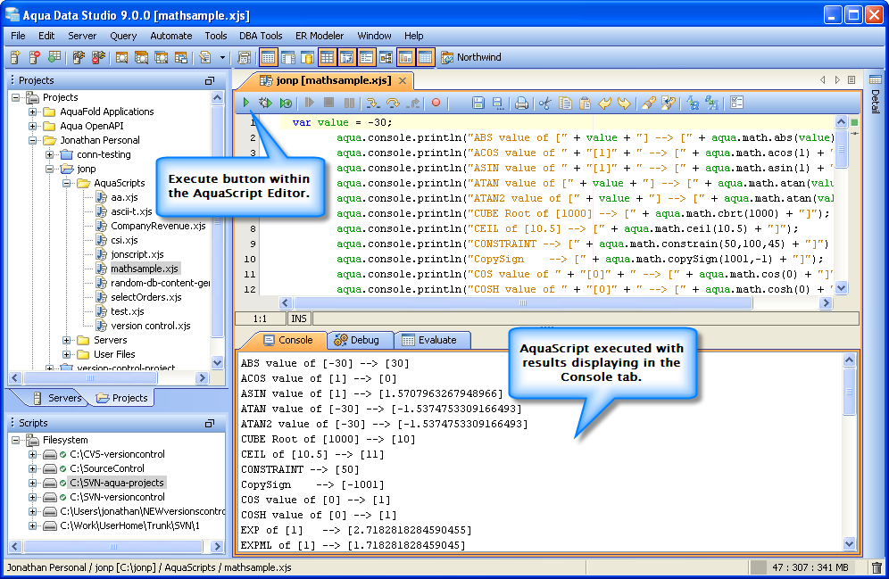 AquaScript Editor: The new AquaScript Editor is a complete and fully functional editor for the JavaScript programming language. It provides autocompletion, syntax coloring, bookmarks, abbreviations, find/replace, incremental search and more. Editing scripts for Aqua Data Studio is as simple as writing JavaScript. The fully-featured editor optimizes the script creation process. The AquaScript Editor takes its syntax highlighting cues from the JavaScript/AquaScript Editor Options.