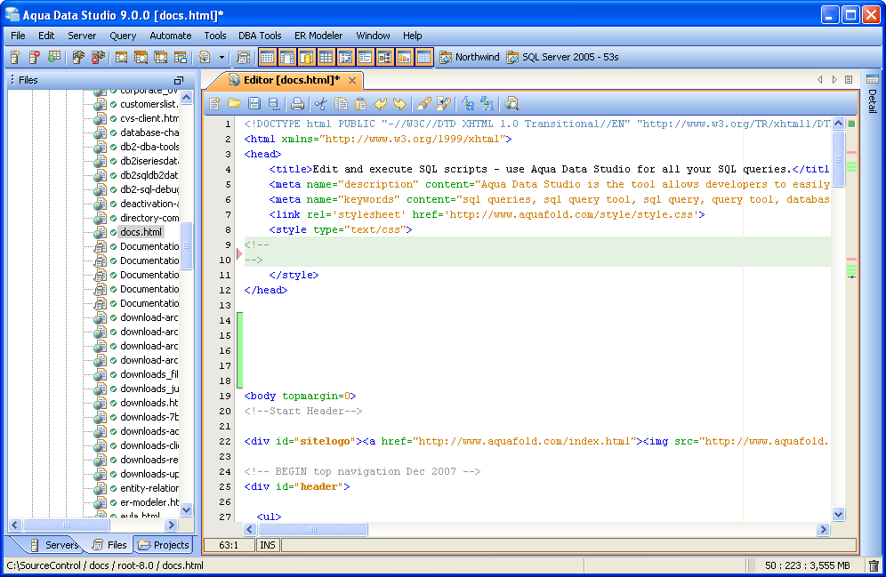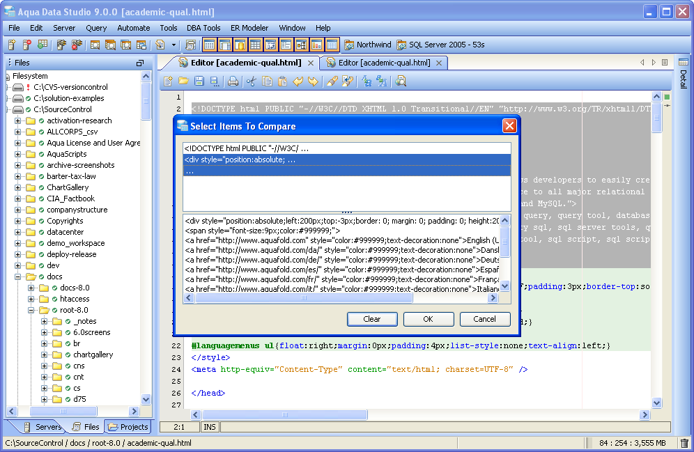 Compare Tools Integration Aqua Data Studio provides Compare Tools for users to easily compare database schemas, schema objects, queries, query results, files, directories, clipboard contents and version control histories. To access the Compare Tools directly, you may use the Application menu under Tools->Compare Tools->[Tool]. Compare tools are also thoroughly intigrated within Aqua Data Studio. When a document that is part of version control is open, and inline compare tools have been enabled (File->Options->Editors->Editor->General:[Inline Diff Sidebar]), the left margin of the document highlights differences between the working version and the repository version. This allows live comparisons with the local source control repository to be run as editing continues. Files viewed within the Repository Browser can also be compared with their previous versions. Depending on the context, the application also makes compare tools available on a per-menu or per tab basis. Selecting two items within the Schema Browser or Files Browser with Ctrl + Click and right clicking allows the selection of Compare from the right click menu. When multiple document tabs are open, right clicking on one of them allows comparing the contents of the documents or query windows. The Copy History Compare Tool allows comparing the contents of the clipboard history. Comparing two Schema Objects is only performed through Ctrl + Click (or Alt + Down Arrow) of two selected items from the Schema Browser. Colored background highlighting and font bolding are used to indicate differences within comparison results. Depending on the comparison type, icons also indicate the presence and absence of content. The coloring Aqua Data Studio uses to indicate Deleted, Changed or Added when displaying compare results is configurable within File->Options->Compare->Colors. Comparison Tuning and Filtering Depending on the type of comparison run (file, schema, results, tab) various comparison filters and options are available. When files, queries or tabs are compared, the comparison functions down to the character level within each. When Database Schemas are compared, the level of comparison granularity can be set by the user for database schema object types as desired. File and Directory comparisons allow selecting for wildcards, file size and file extension allowing for exclusion of .svn, CVS, .DS_Store, Thumbs.db, .bak and other file types. For even more control over the comparison, filters can be run once the comparison is completed. The presented comparison results can then be sorted by columns displayed in the comparison. The results of all comparisons (except the inline-diff within editors) can be saved as HTML for storage or sharing. The Six Compare Tools When accessed through the Tools menu, there are 6 comparison tools available: