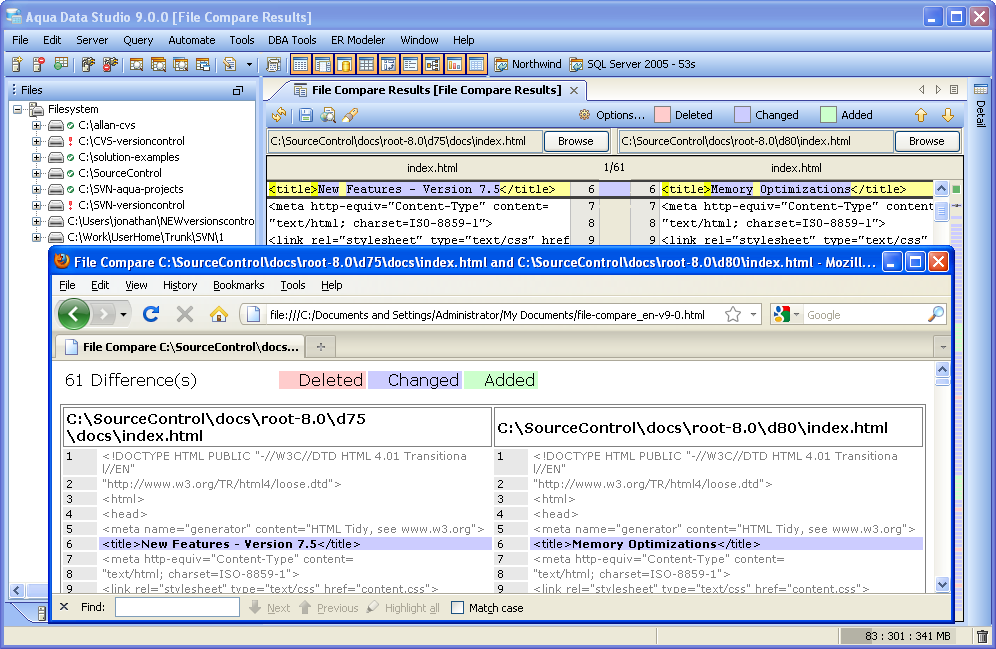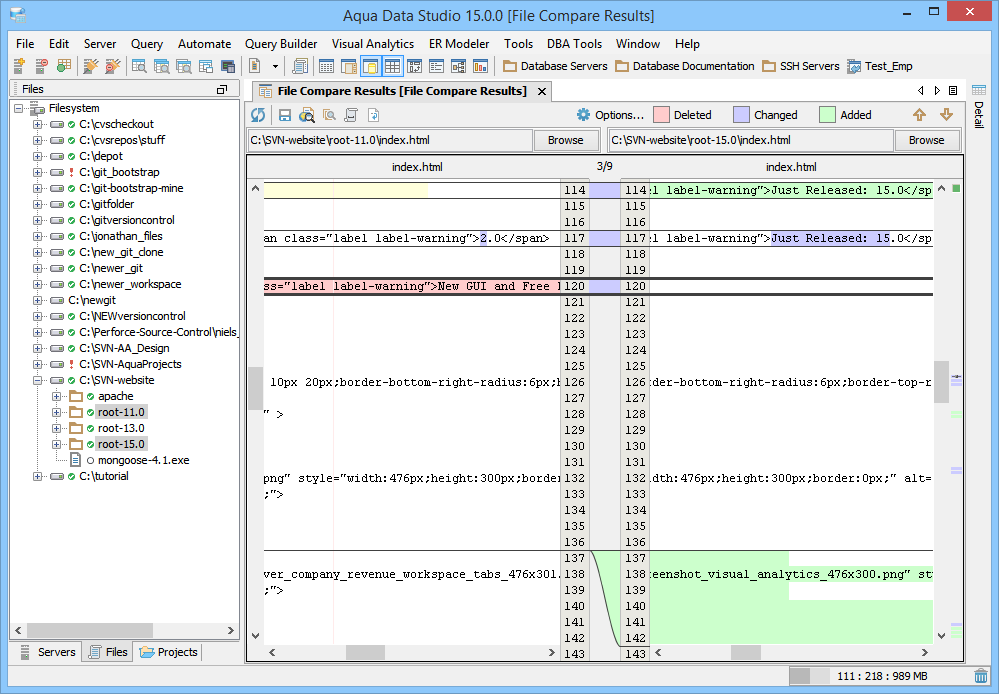 Launching the File Compare Tool The File Compare Tool provides users a method of depicting differences in the content between two text-based files. To compare two files, either multi-select individual files in the Files Browser from mounted directories, or launch the File Compare Tool from Tools Menu (Tools->Compare->File Compare) and browse to them. If the File Compare Tool is launched from the Tools Menu, it is possible to choose files that are not listed in the Files Browser, but are available to the operating system. It is also possible to drag items into the application from the operating and drop them off on the File Compare Tool file selection window. Filters to exclude files by file size, name, directory, or file extension can be selected before the comparison is run using the "Show Differences" button. The File Compare Tool keeps the last files selected when the application is restarted and the File Compare Tool is relaunched. When the comparison is being performed, it runs in a background thread so that other operations in Aqua Data Studio can be performed. Comparison Results The results of a comparison display as a split-pane with line numbering down the center and connecting splines for identifying where the deletions, changes and additions occur. Each file in a comparison takes up half of the comparison results window and each can be vertically scrolled independently of the other. At the top, between the two files above the line numbering, digits separated by a / indicate the difference selected out of total number of differences discovered (i.e. 9/27). The large up and down arrows at the top of the comparison results allow navigating through the differences one at a time. Comparisons show the character differences in a modified line with bolding and background color highlights indicate modified blocks. If they are not identical they are highlighted by default in pink (deleted), purple (changed) or green (added). The colors for the difference highlighting can be changed with the Options button at the top right of the comparison results. Annotation Bar The annotation bar provides a bird's eye view of all of the differences detected in a comparison. When differences are found, their corresponding highlight colors appear in the annotation bar on the right side of the results and can be used to quickly navigate to them. If a marker in the annotation bar is used to navigate to a particular difference by left clicking, a tick mark overlay shows which difference currently has focus. Once the comparison is complete, it can be refreshed, allowing the same comparison to be run again. It is also possible to select two new files for comparison by clicking the "Browse" buttons at the top of the comparison results without having to launch the Compare Tools Menu again. Saving Comparison Results as HTML The results of a comparison can be saved as HTML for viewing later or for sharing with others. The "Save As HTML" button at the top left of the comparison window prompts for file destination and font selection. If the "Preview in Browser" icon is clicked the user is prompted to first "Save as HTML" for launching a web browser. If the comparison has already been saved as HTML, clicking "Preview in Browser" launches a browser with the stored HTML. |
