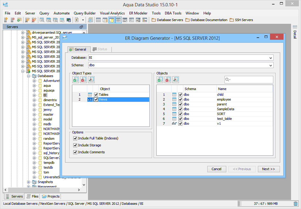 Generate ER Diagram (Schema Browser) From within Aqua Data Studio's Schema Browser 1. Right click on the desired database or schema object and select Tools->Generate ER Diagram (or choose Tools->Generate ER Diagram from the Main Application Menu and select the database server and database). 2. Choose the object types and objects to be generated in the ER diagram. Select what schema, and schema objects are to be generated in the diagram. Use the quickfilter to focus a search to key words or wildcards. Individual Object Types (Tables, Views) and individual Objects can be selected. Table Storage can be included in the diagram. Click next. 3. View the progress of the ER Diagram generation. 4. The objects selected for ER Diagram generation display in the ER Modeler as entities in a new, unnamed diagram. |