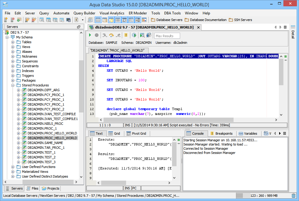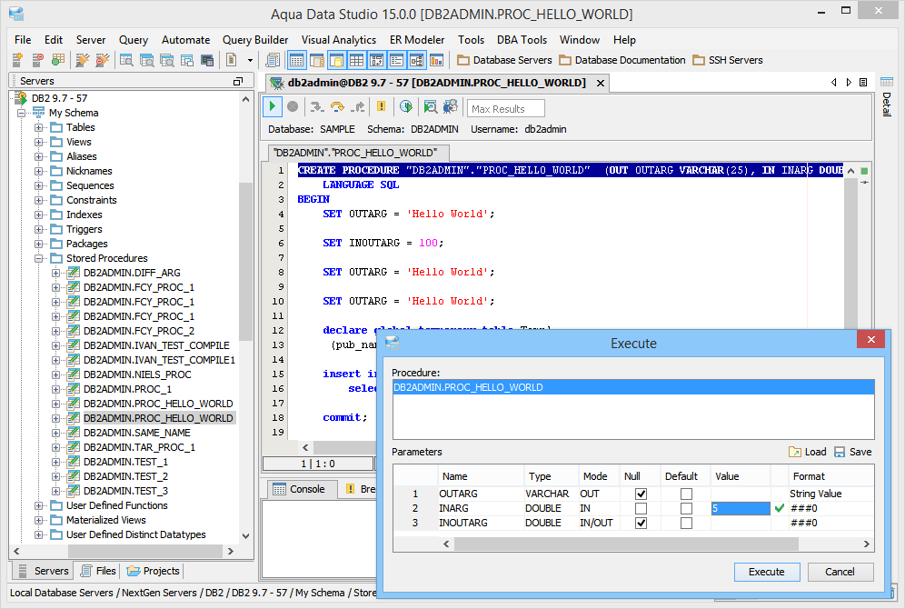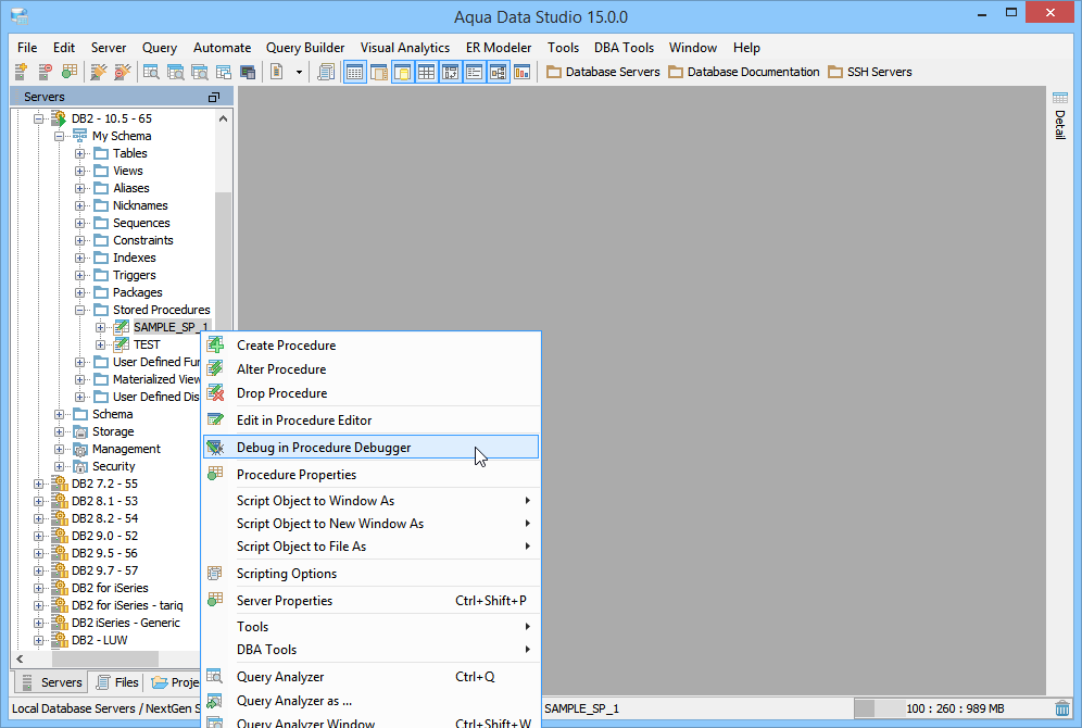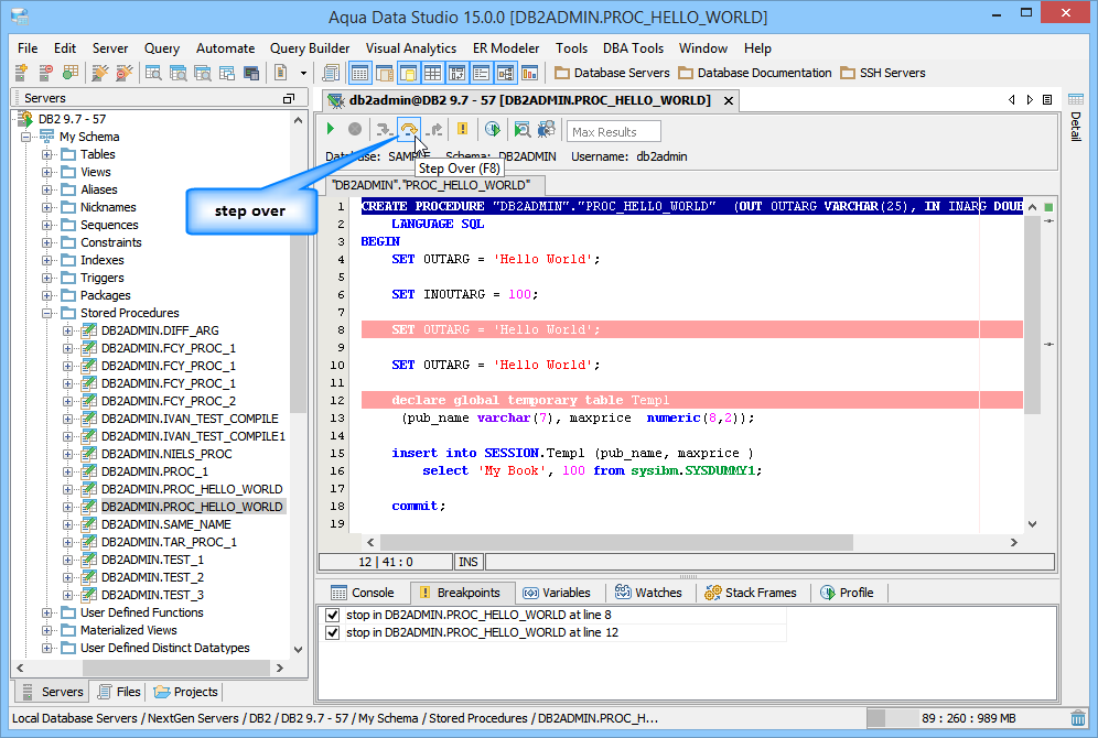 The DB2 SQL Debugger has been designed to help with testing and debugging of SQL stored procedures for DB2 versions 9.0 and above. Launching the DB2 SQL Debugger The DB2 Debugger is launched through a right click in the Schema Browser on Stored Procedures and selecting Debug in Procedure Debugger from the popup menu. More than one debugger can be open at once, with each object to be debugged opened in a separate tab. Debugger Workspace The debugger displays a slightly modified version of the Query Analyzer Toolbar containing debugger specific menus and buttons. Along the top of the debugger are the Execute, Stop, Step Into, Step Over, Step Return, Toggle Breakpoint, Turn On Profiling, Target Query Window, Debugger Query Window buttons. Next to the buttons is the Display Max Results input field. Beneath the buttons is the connection information, username and SID information. The procedure displays in the debugging window, within which breakpoints can be added by right clicking and selecting "Toggle Breakpoint" from the popup menu. When this window has focus, and a line has been clicked, it is also possible to select "Run to Cursor," to run the debugger up to that line in the procedure. From the same popup menu, "Go to Current Line" brings the cursor to the current line, which is very useful when debugging multiple lengthy procedures. Below the debugger window are tabs for Console, Breakpoints, Variables, Watches, Stack Frames and Profile. The Console tab displays any errors or messages generated as debugging progresses. The Breakpoints tab indicates the lines of the procedure where breakpoints are set and allows them to stop execution or not. The Variables tab lists any variables by name, their value and type. The Watches tab allows selecting specific variables to be observed as they change, reducing from a possible list of hundreds to a select group. The Stack Frames tab lists the local variables of the functions, and the arguments to them. The Profile tab lists commonly used terms or values a user works with on a regular basis in the debugging process. Once execution of a procedure has begun through the use of the Start button at the top of the debugger window, the bottom left of the window is occupied by the Text, Text History, Grid, and Pivot Grid Results tabs. This area functions just as the Query Analyzer window does, revealing the results of procedures at each breakpoint or execution cursor. The DB2 SQL Debugger features include: