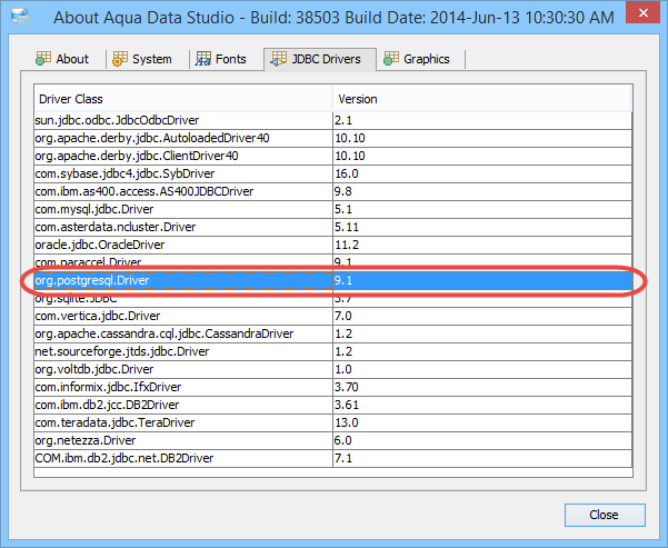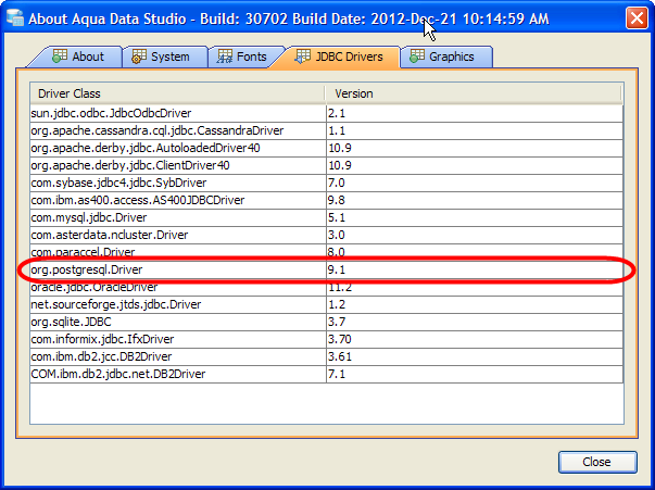 To update the Aqua Data Studio JDBC drivers for PostgreSQL you need to overwrite the Aqua Data Studio postgresql.jar file. Below is a listing of the Aqua Data Studio library directory [ADS_INSTALL]\lib\drivers\ ...