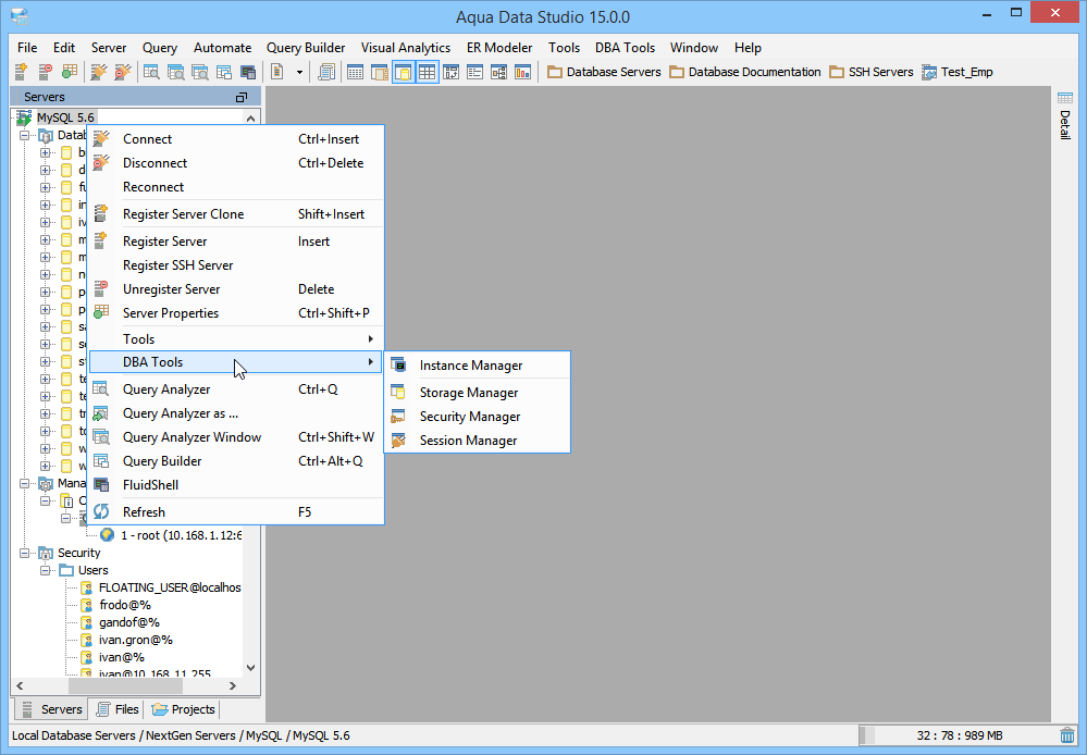 MySQL Database Administration (DBA) Tools - The MySQL Database Administration (DBA) Tools provide users with the tools to administer, manage and monitor all aspects of a MySQL database. The tools may be accessed from the application DBA Tools menu or from the schema browsers context sensitive popup menu. The following is a list of tools provided with a description of each tools functionality.