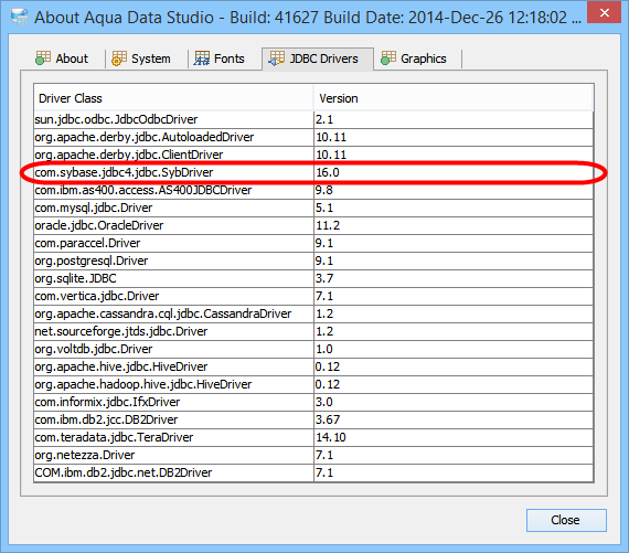 Aqua Data Studio comes bundled with the Sybase jConnect 16.0 JDBC drivers. These drivers are compatible with all Sybase IQ versions 12.5 - 16.0. It is also possible to use the Sybase iAnywhere drivers by following the steps below for Downloading and using Sybase iAnywhere JDBC Drivers.