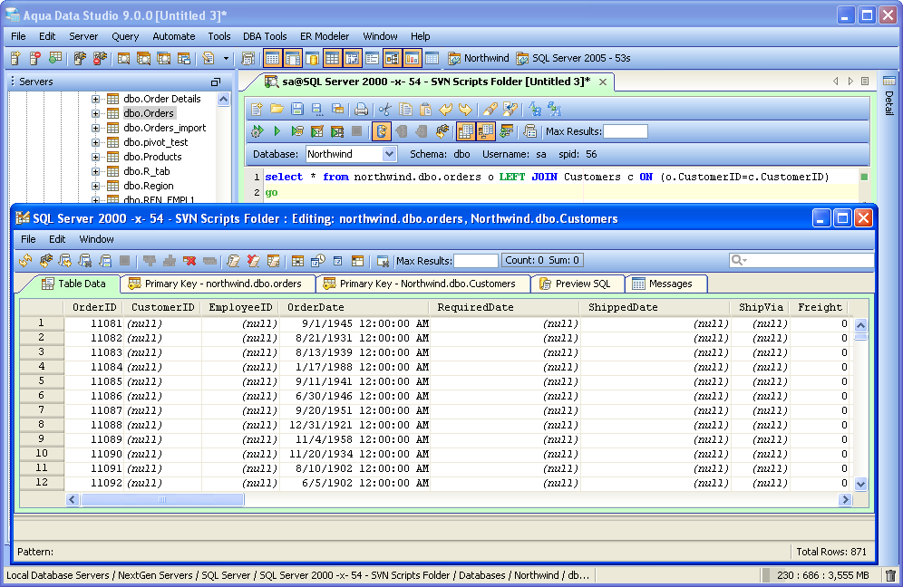 Aqua Data Studio provides a Table Data Editor which allows a user to graphically edit the resultset of an executed query on a table, including its data and rows. The editable result set is displayed in an Excel like grid. To activate a table editor you must either right click on a table in the Schema Browser and select "Edit Table Data (Top 1000)" or write a table SELECT statement and use the "Execute Edit" button. This will execute the query and return the resultset in a new Table Editor window. From this window a user may edit and save the contents of the resultset. The editor uses the primary key or any unique constraint to identify the row in the result which it will generate UPDATE statements for. If your resultset doesn’t have a primary key or unique constraint, you will be prompted to define a primary key in the primary key tab. A check mark indicates which column(s) participate in the primary key. There is an option within File->Options->Permissions to allow Primary Key Definition Changes. Table Data Editor Workspace Like the other tools of Aqua Data Studio, the Table Data Editor is part of the Application Docking Framework. The window for the Table Data Editor can remain open as other tools in Aqua Data Studio are used. The Table Data Editor's menus and icons are taken directly from the Main Application Toolbar. Their functionality for refreshing and reconnecting to database servers has been included to make it easier to reconnect and refresh table data without having to access the Main Application Menus and Toolbar. At the top are the File, Edit and Window menus. Below are Toolbar icons for Refresh, Reconnect, Save and Refresh, Save and Close, Save Script ("Save Script" stores the chosen directory path and uses it for subsequent save operations as a default directory for easier navigation), Stop, Add Row Above, Add Row Below, Clone Selected Row(s), Clear All Changes, Clear Selected Deleted Rows, Clear Changes in Selected Cells, Set Cells to Null, INSERT Current Date and Time, INSERT Current Date Only, Edit in Window, Close Window, Max Results, Aggregate Functions (when enabled) and Quick Filter. Below the Toolbar Icons are the tabs for Table Data, Primary Key, Preview SQL and Messages. The Window menu can be used to cycle through tabs when so many exist it is difficult know which one was focus via Window->Next Tab; Window->Previous Tab; Window->Focus Max Results. The layout of the data within the Table Data tab functions similar to a spreadsheet appliction, with the ability to insert rows and cells where desired via Find and Replace when needed. Most of the work done in the Table Data Editor occurs in the Table Data tab, which displays the data for the table(s) from the select statement used in the Execute Edit mentioned earlier. Row color and bolding assist in displaying recent changes and nulls in the data, and appear in the Table Data Editor modification logs (when enabled in File->Options->Table Editor->Modification Logs). A box appears around the content inside of a selected cell to identify content length where blank spaces may appear before text, but not be visible. Table Columns, must be added or removed from tables via context menus with right clicks in the Schema Browser or through the Query Analyzer by way of database commands. Using Edit->Format: AutoFit Column Width, cells can be highlighted and resized automatically using the menu, a key shortcut, or a double-click on the right border of the column header. This option can be configured from the dropdown menu. The Primary Key tab displays a list of all of the columns relating to the tables in the query used to launch the Table Data Editor via the Execute Edit command from the Query Analyzer. If more than one table was used in the query, a dialog appears to choose the primary keys and an additional Primary Key tab will display for each table with schema information in the tab title. The Preview SQL tab displays the DDL used to perform the edits made within the Table Data Editor with appropriate Syntax highlighting. The Messages tab displays any warnings or messages during table data modification. At the bottom of the Table Data Editor window are the Preview Panel (when enabled) and Status Bar. The Preview Panel creates a cell's preview in a split panel to allow the user to preview the currently selected value in the grid. This helps the display the full value of a narrow cell, including long string values or CLOB values. The Status Bar contains Pattern information to show the data type and range of selected cells at the bottom left, and Total Rows of the table at bottom right. After the changes are saved and the table is refreshed (Save and Refresh), the cursor selects the first cell of the selected row before save. When closing a modified window the application will prompt for "Save," "Discard" and "Cancel." Visual Editing The Table Data Editor allows you to add, edit and delete rows and changes in the editor are color coded so that you may see your changes before commiting them. Inserted/Modified/Deleted rows have light blue cell background. Modified cells have a slightly darker color for the text so it allows the user to see spaces. Cells in Inserted Rows also have the background color of the text shaded to identify invisible characters.
