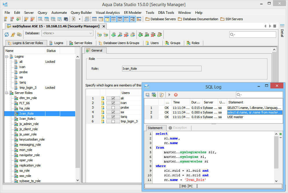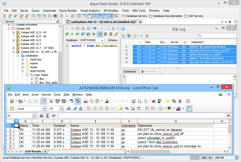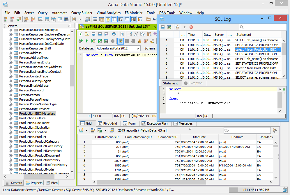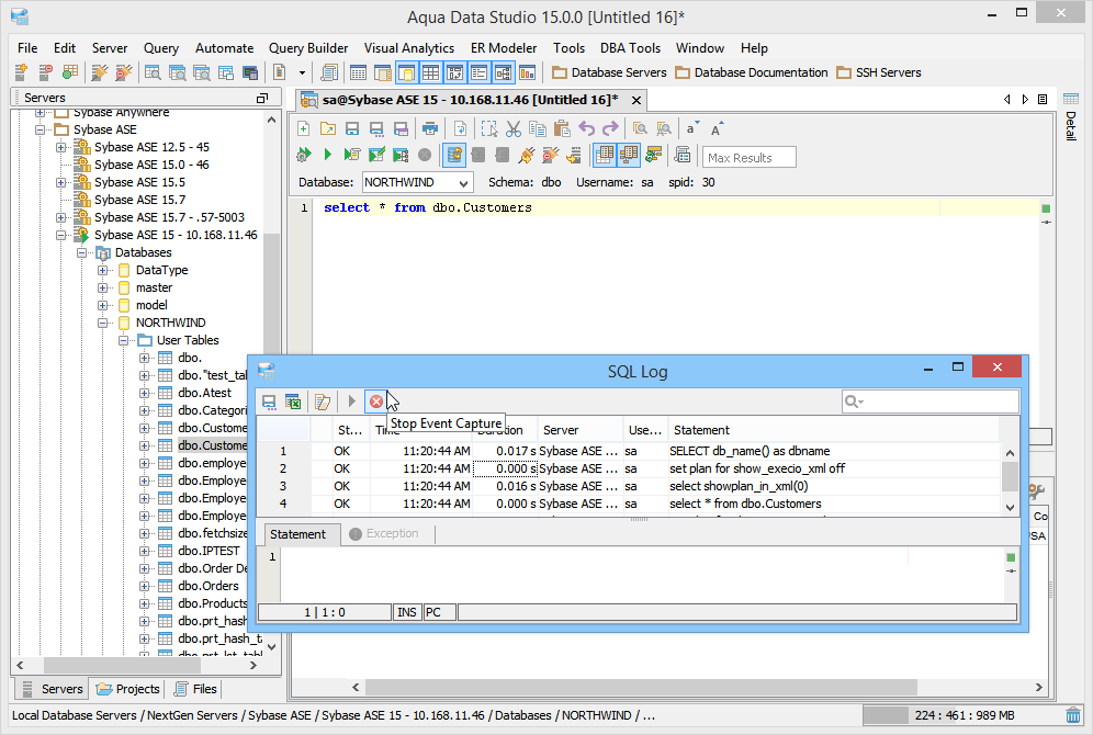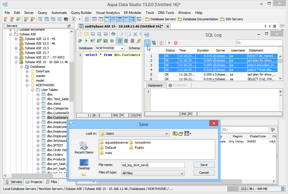 The SQL Log is a visual log tool for recording any SQL queries executed by Aqua Data Studio; all queries manually executed in the Query Analyzer by you the user and any of Aqua Data Studio's internal queries for displaying information within the GUI. When the SQL Log is opened, it immediately begins recording and provides a much more detailed capture of database interaction than the SQL History alone. If the Schema Browser is used to expand a database object to view its content, the SQL Log instantly displays the query the application uses to retrieve that information. This makes it an effective tool for monitoring the execution of statements within Aqua Data Studio.