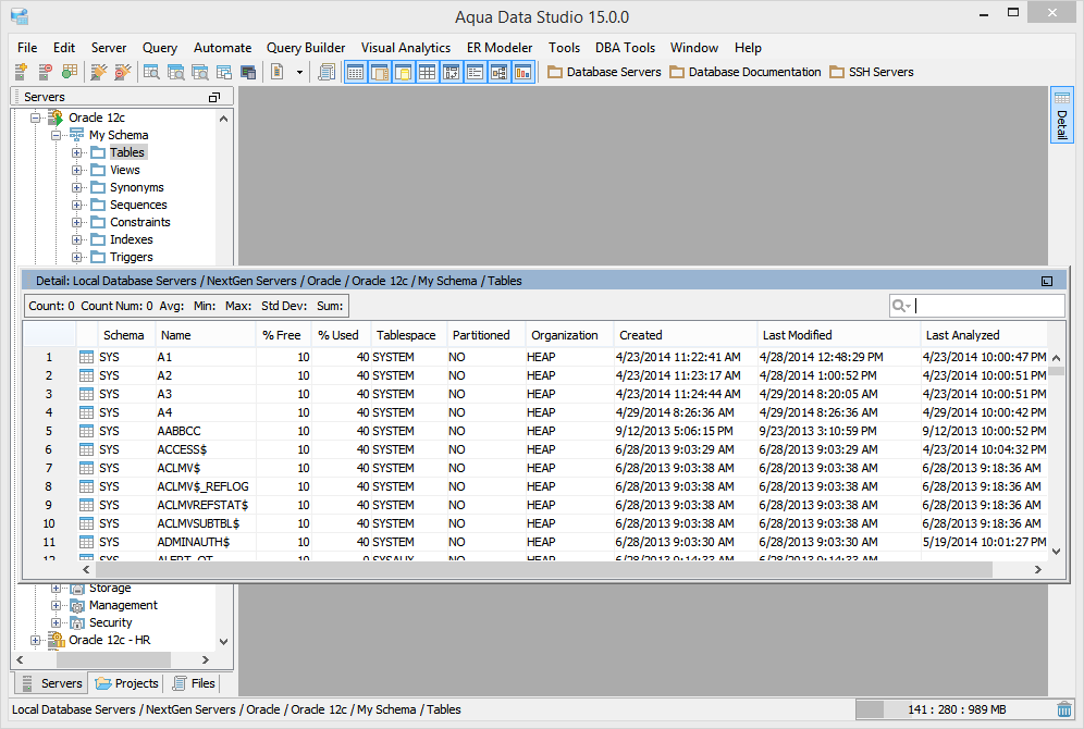 The button on the right hand side of the Query Window marked "Detail" turns on and off the Detail View. Content displayed within the Detail View varies based on the database object, vendor and version selected. Files within the Files Browser display modifcation date and time when their containing directory is selected. When several objects are selected, their details can be viewed. This makes it convenient to check offline or online status of several databases at the same time, or see the modification dates on files within a directory.