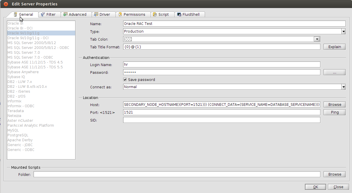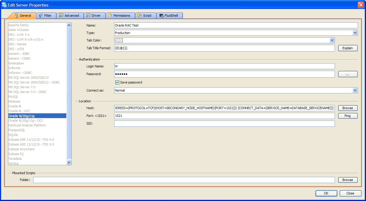 Aqua Data Studio also allows you to connect to Oracle RAC and Oracle Connection Manager by entering into the TNS Descriptor:
