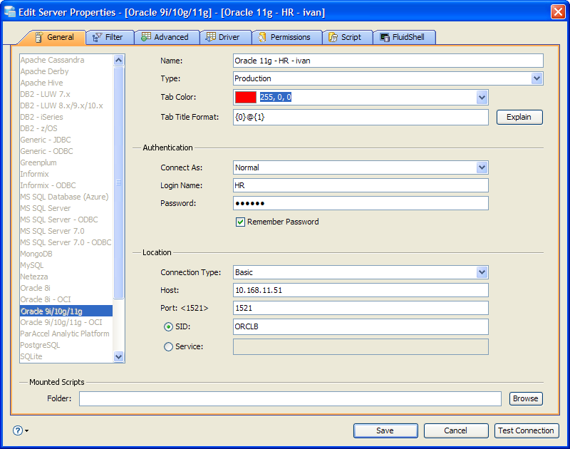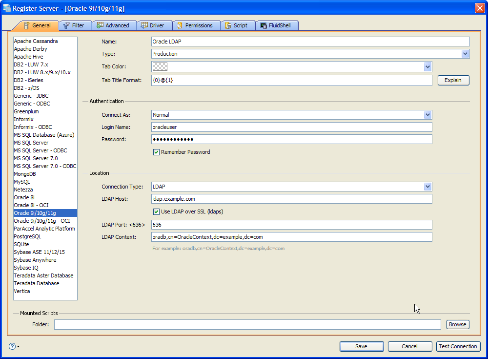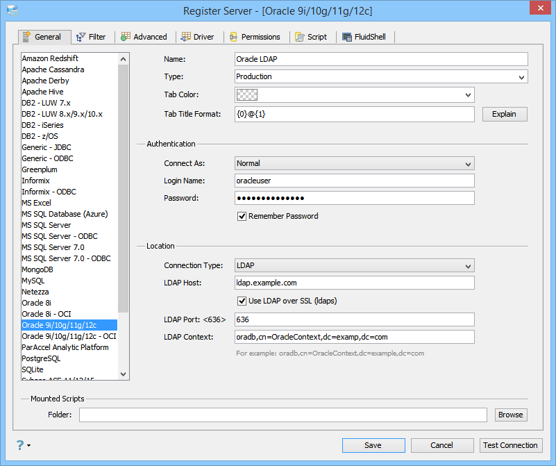The UI supports three connection types for Oracle: Basic, TNS Descriptor and LDAP.