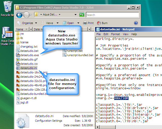 In your installation directory (default: "C:\Program Files\Aqua Data Studio") there is a file called datastudio.ini which contains JVM parameters for startup. In this file you may modify the line "vmarg.2=-Xmx384M", where ’384’ is equal to the amount of memory allocated to Aqua Data Studio. You can change this number to increase your memory to 512MB, 1024MB or larger. Once you have made your changes, restart Aqua Data Studio.