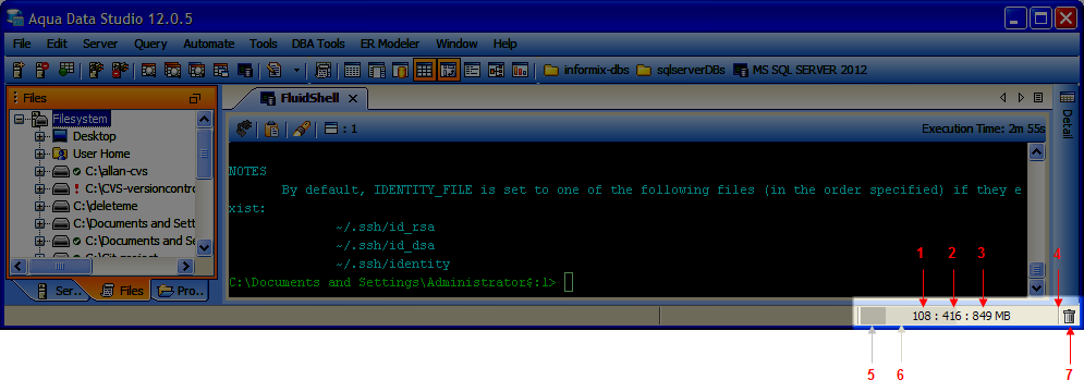 You can quickly view how much of your JVM’s RAM is being used by Aqua Data Studio by looking at the bottom right corner of the Main Application window in the Memory Statistics Display, next to the Garbage Collection icon which is a tiny trashcan. If you find you're running low on memory, you can increase the memory allocated to Aqua Data Studio. Instructions below.