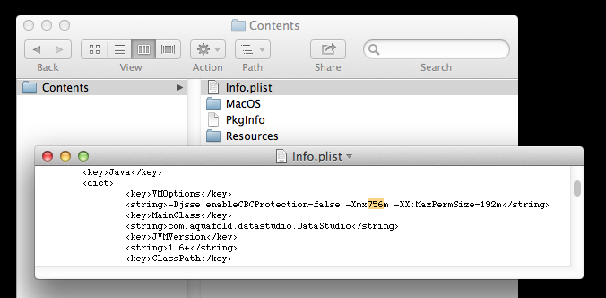 The OSX double-clickable application is actually a directory structure with an extension of ".app". You may modify the files in this directory structure by right-clicking on the Aqua Data Studio icon and selecting "Show Package Contents" where you can browse to edit Contents/Info.plist with TextEdit. This file is an XML file containing startup parameters for Aqua Data Studio. To change or increase the memory edit the number in the JVMOptions section preceded by -Xmx where ’756’ is the amount of memory you want for Aqua Data Studio. Example ...
