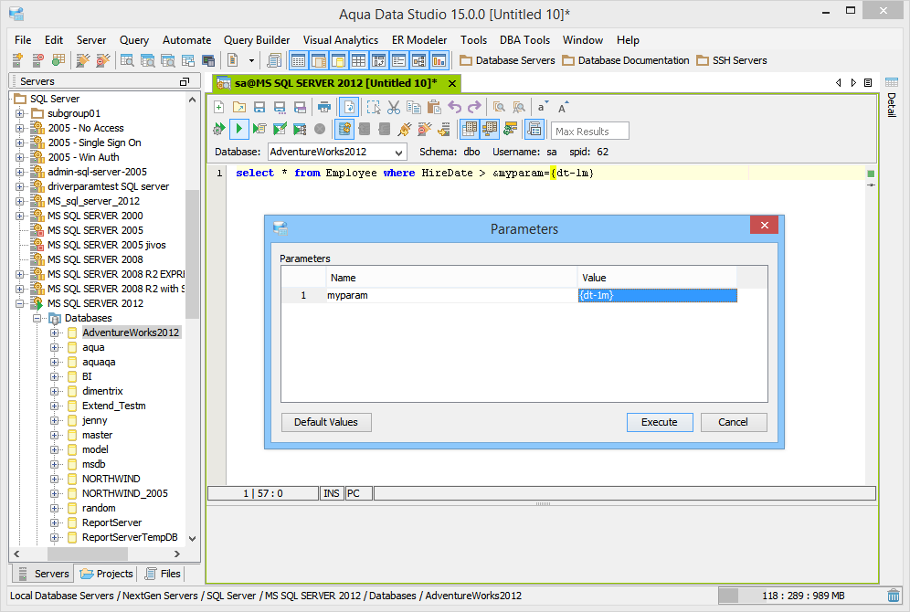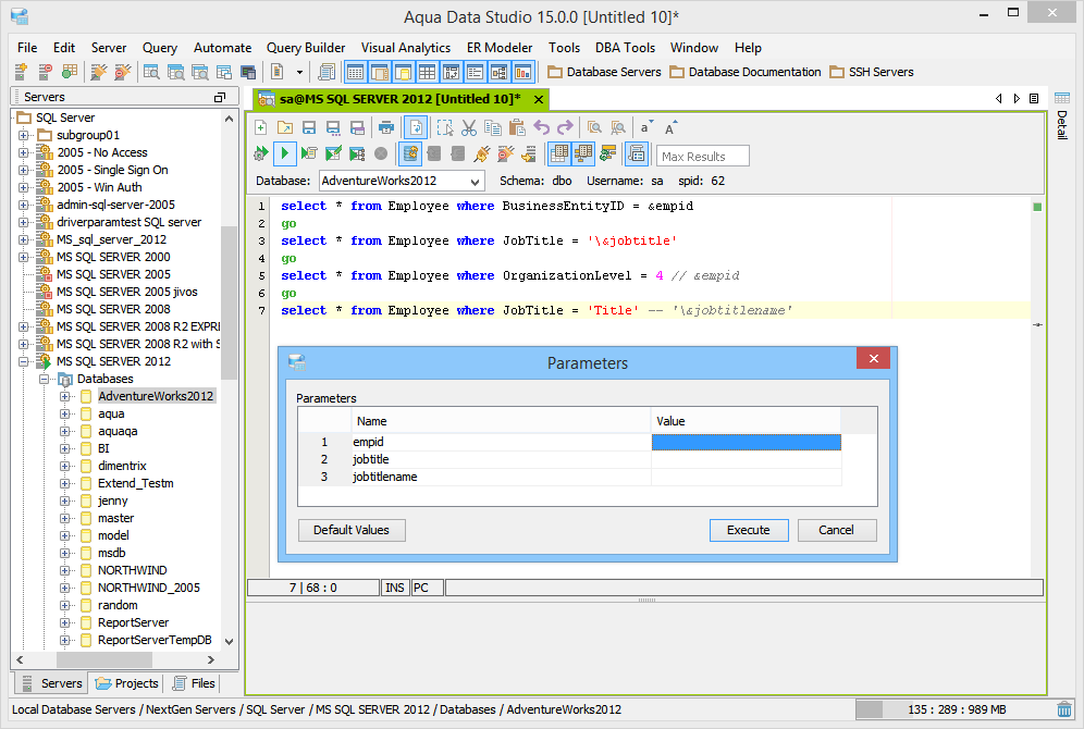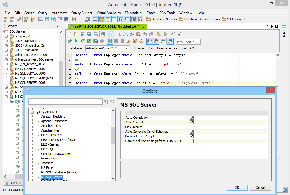 The Query Analzyer supports parameterized scripts. From the Query Analyzer Toolbar, the user may enable/disable the ability to support parameterized scripts. There is also an option to keep parameterized scripts enabled for all query analyzers based on vendor and version under File->Options->Query Analyzer. By enabling Parameterized Scripts, the user may have scripts with defined parameters so that Aqua Data Studio will prompt for the values of the parameters before executing the script. Executing a Parameterized Script