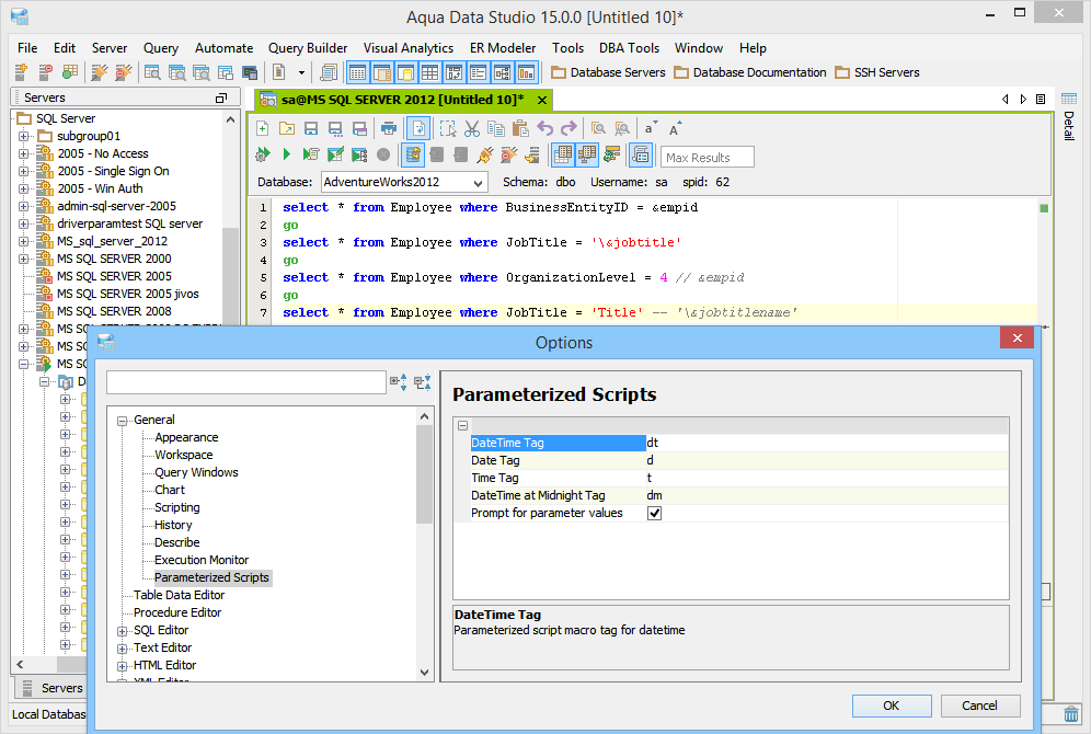 Parameters are also supported in server side comments. Client side and server side comments may be defined in File->Options->Scripts for each database. If a parameter is defined in a client side comment it will be ignored. Parameters in server side comments will be prompted and replaced. Date and time expressions in parameter values scripts. This feature allows a user to specify a default value of a parameter to be a date expression. File->Options:General:"Parameterized Scripts" has the option to specify the tags for the date and time expressions and whether to prompt