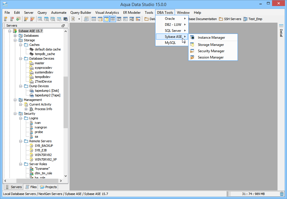 Sybase Database Administration (DBA) Tools - The Sybase Database Administration (DBA) Tools provide users with the tools to administer, manage and monitor all aspects of a Sybase database. The tools may be accessed from the application DBA Tools menu or from the schema browsers context sensitive popup menu. The following is a list of tools provided with a description of each tools functionality.