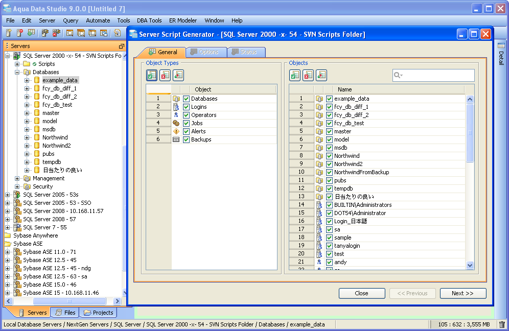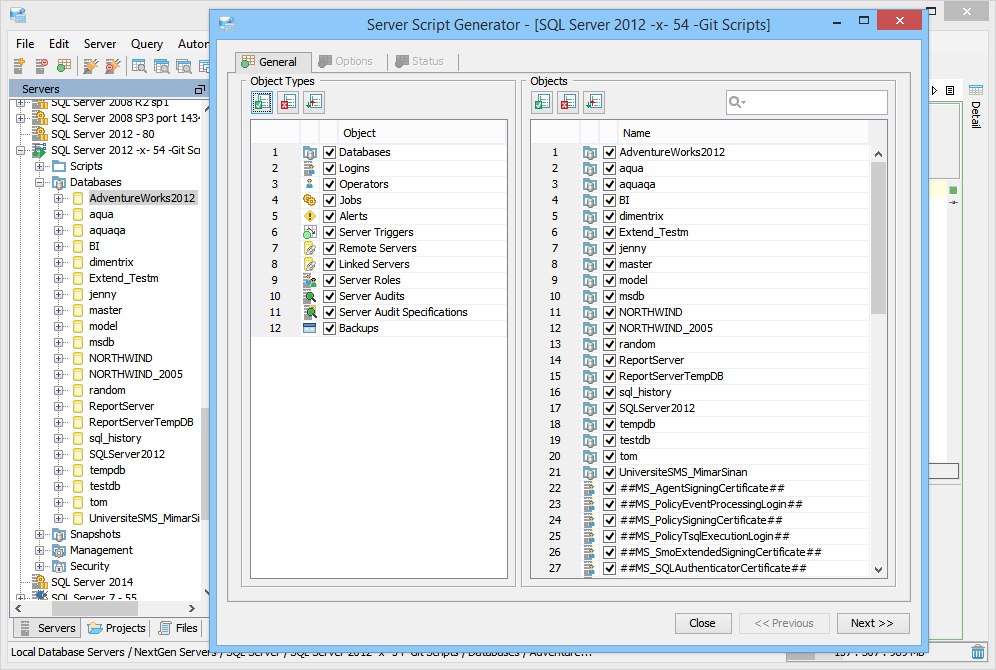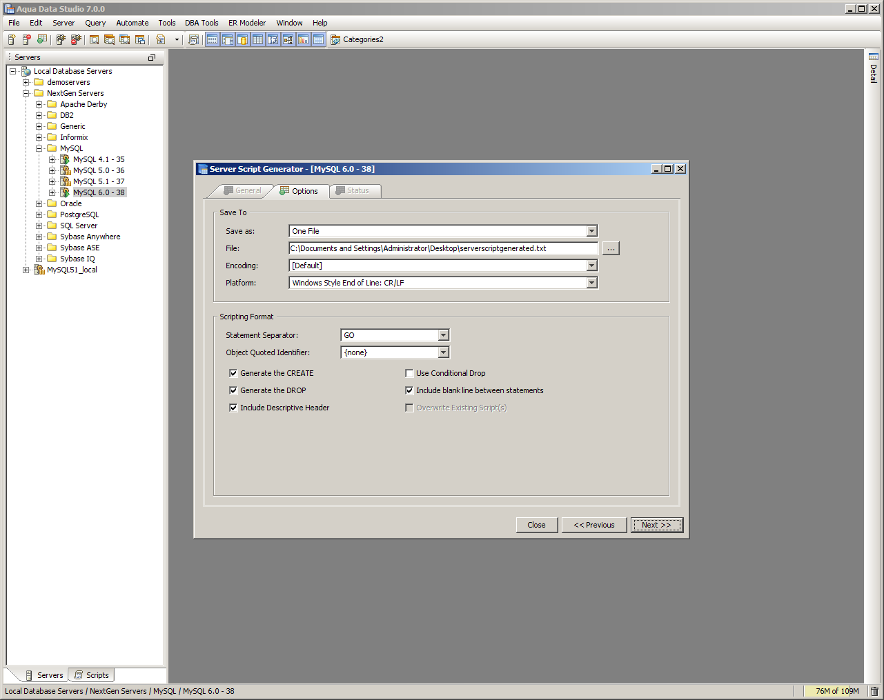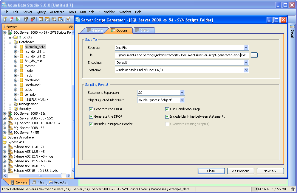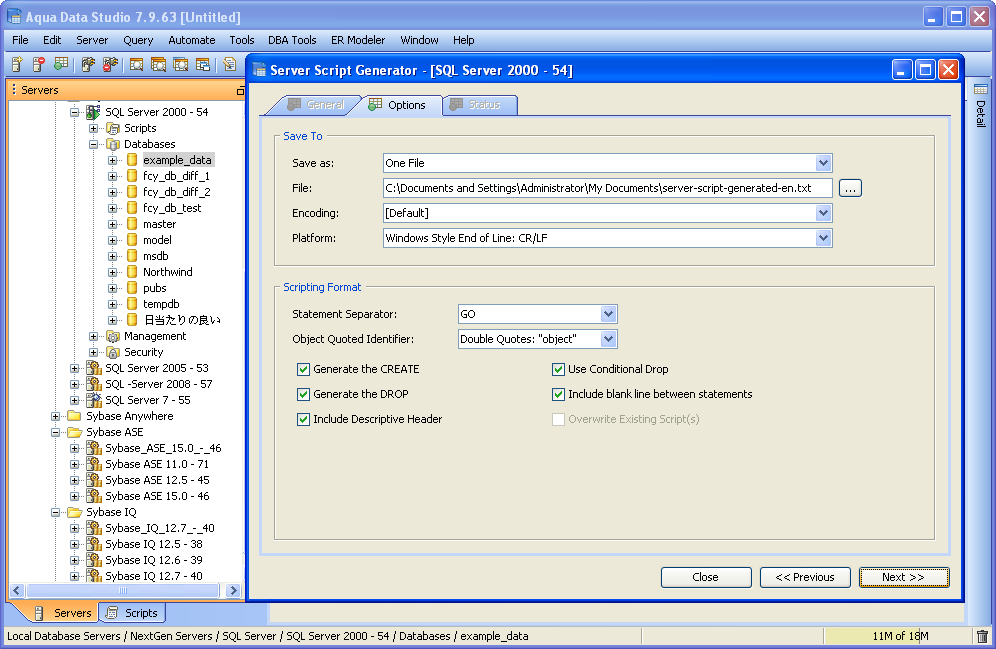 Aqua Data Studio’s Server Script Generator generates SQL Scripts for Server Objects in a database by producing a single script file of all contained server objects or individual server script files per object. Server Scripts are used for database management of backups, alerts, logins, users, roles, profiles, tablespaces and other server-based objects. The server objects available for scripting vary depending on database vendor and version. The Server Script Generator differs from the Schema Script Generator in that Server Scripts are for database management, while Schema Scripts are for schema objects such as tables and procedures. The Server Script Generator can generate syntax highlighted scripts in a preview window for copy and paste. The steps to Generate Server Scripts are described below. 1. Launch the Server Script Generator dialog by Selecting Tools->Server Script Generator from the Menu Bar, or selecting Tools->Script Generator from the right-click pop-up menu on a database in the Schema Browser. 2. In the General Tab, select a Database and pick its Server Objects. In the left panel, select one or more types of objects to be scripted. Click the green check button to select all, the red X button to de-select all, or the red/green button to revert the current selection. All objects matching the selected types will appear in the right panel. Select one or more objects to be scripted. The quickfilter can be used to select objects via wildcards. Click the green check button to select all, the red X button to de-select all, or the red/green button to revert the current selection. Click Next. 3. In the Options Tab specify where to save the generated script or scripts. Save as One File so that all SQL Statements will be output to a single file. Save as One File Per Object so that SQL statements will be output to one file per object, or Preview the SQL so that all the SQL statements will be output to the Preview tab for copy and paste. The directory and file name, encoding and platform of the file can be set. Select any appropriate options for: