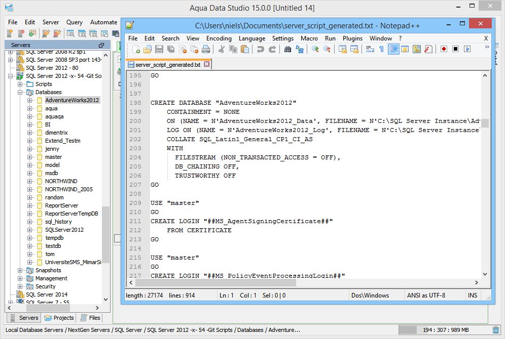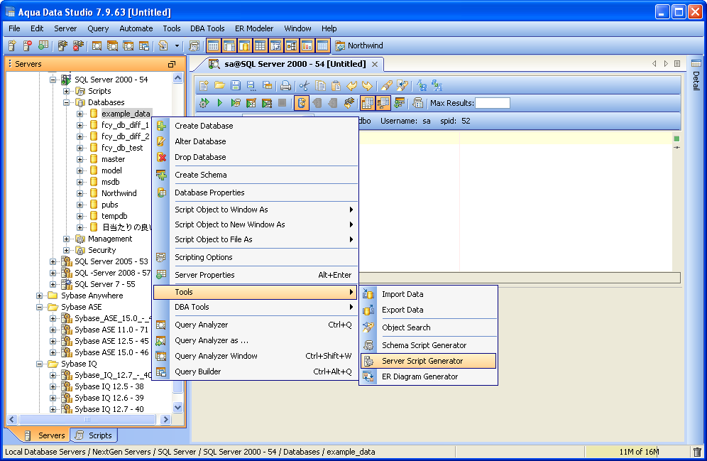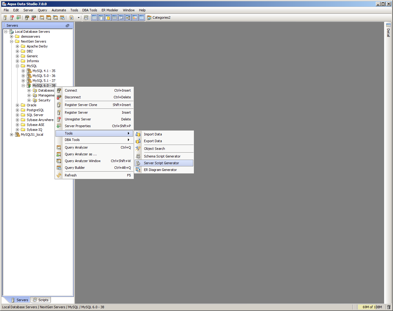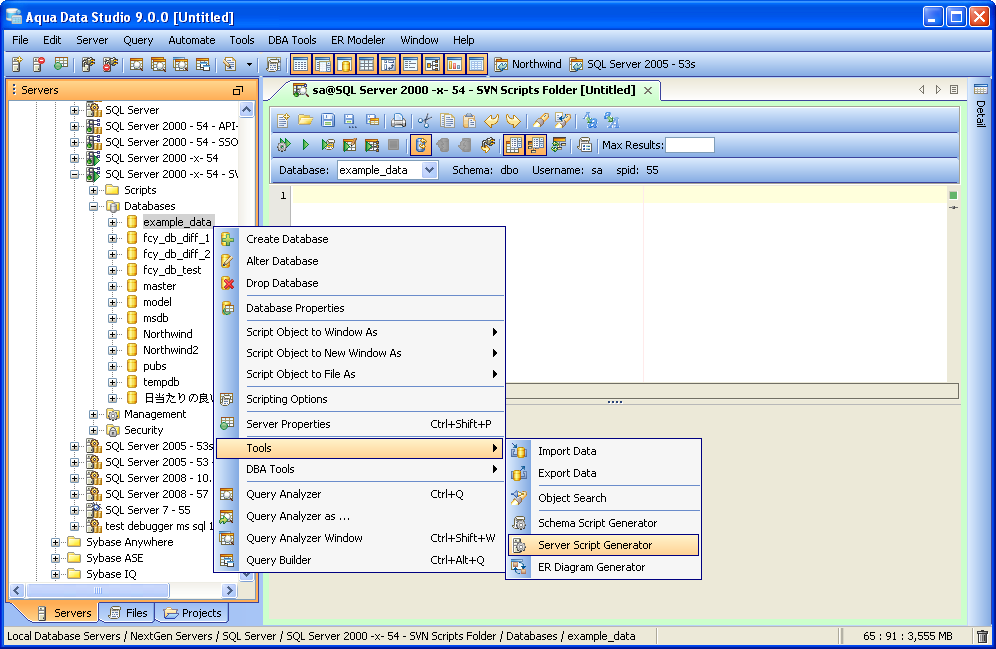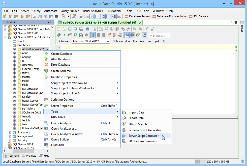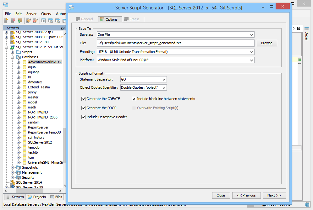Aqua Data Studio’s Server Script Generator generates SQL Scripts for Server Objects in a database by producing a single script file of all contained server objects or individual server script files per object. Server Scripts are used for database management of backups, alerts, logins, users, roles, profiles, tablespaces and other server-based objects. The server objects available for scripting vary depending on database vendor and version. The Server Script Generator differs from the Schema Script Generator in that Server Scripts are for database management, while Schema Scripts are for schema objects such as tables and procedures. The Server Script Generator can generate syntax highlighted scripts in a preview window for copy and paste. The steps to Generate Server Scripts are described below. 1. Launch the Server Script Generator dialog by Selecting Tools->Server Script Generator from the Menu Bar, or selecting Tools->Script Generator from the right-click pop-up menu on a database in the Schema Browser. 2. In the General Tab, select a Database and pick its Server Objects. In the left panel, select one or more types of objects to be scripted. Click the green check button to select all, the red X button to de-select all, or the red/green button to revert the current selection. All objects matching the selected types will appear in the right panel. Select one or more objects to be scripted. The quickfilter can be used to select objects via wildcards. Click the green check button to select all, the red X button to de-select all, or the red/green button to revert the current selection. Click Next. 3. In the Options Tab specify where to save the generated script or scripts. Save as One File so that all SQL Statements will be output to a single file. Save as One File Per Object so that SQL statements will be output to one file per object, or Preview the SQL so that all the SQL statements will be output to the Preview tab for copy and paste. The directory and file name, encoding and platform of the file can be set. Select any appropriate options for: