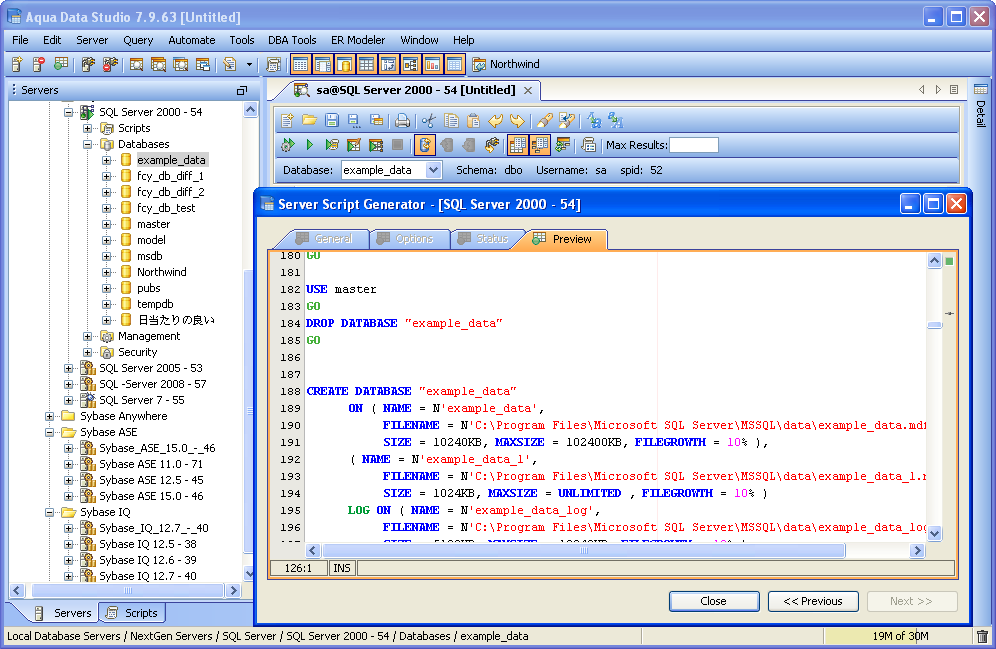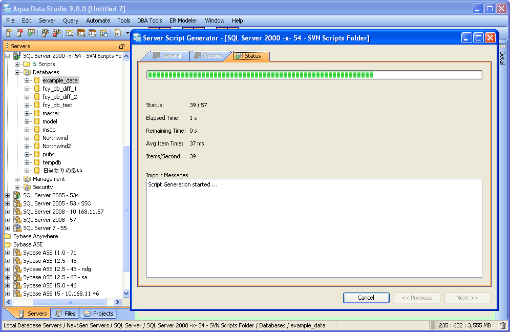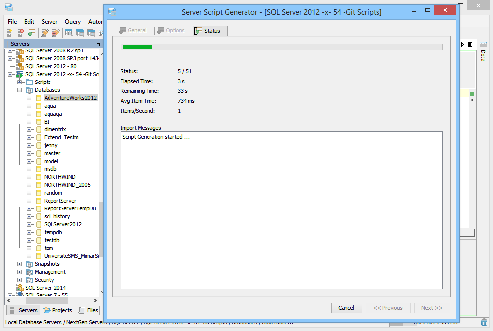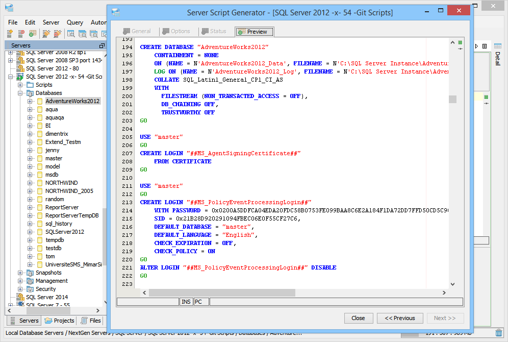 4. Click Next to generate the scripts for the selected objects. The Status Tab displays the progress of the Server Script generation, with Elapsed Time, Remaining Time, Average Item Time and Number of Items per Second. The output process can be halted at any point by clicking Cancel. Error and Warning messages apear in the "Important Messages" pane at the bottom of the Status Tab. 5. If Preview was selected as the destination of the export, the Preview Tab displays the export with syntax highlighting for copy and paste use. Click Close to close the dialog or click Previous to change selections and regenerate the script(s). |