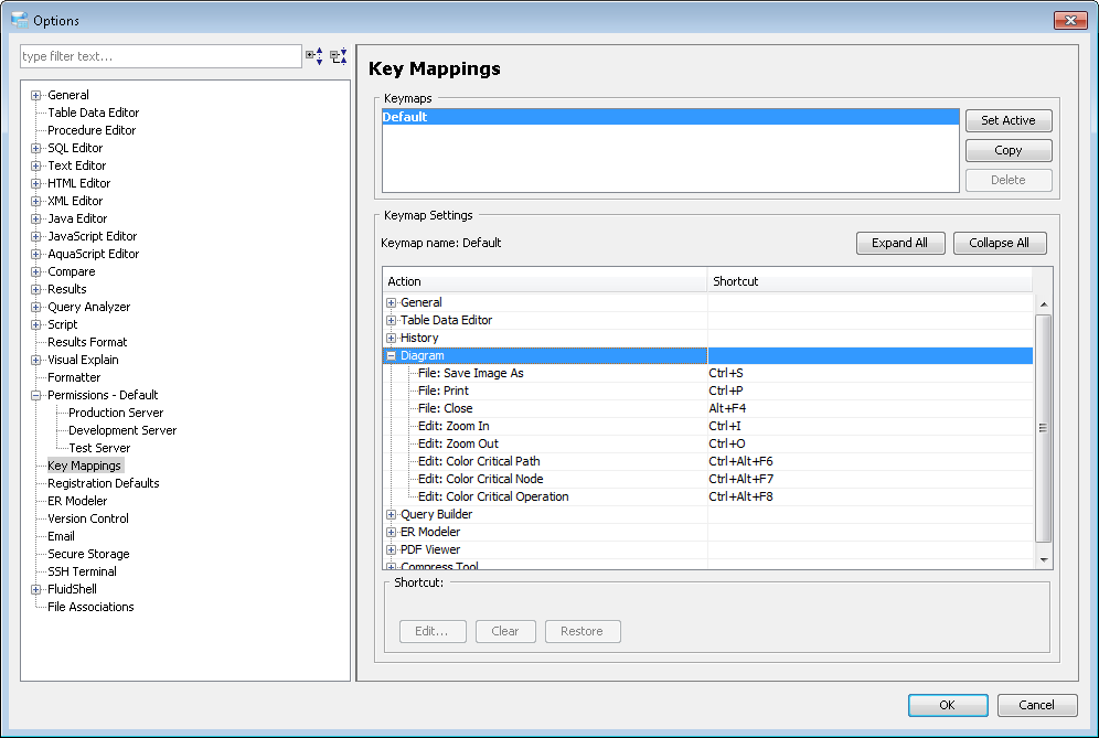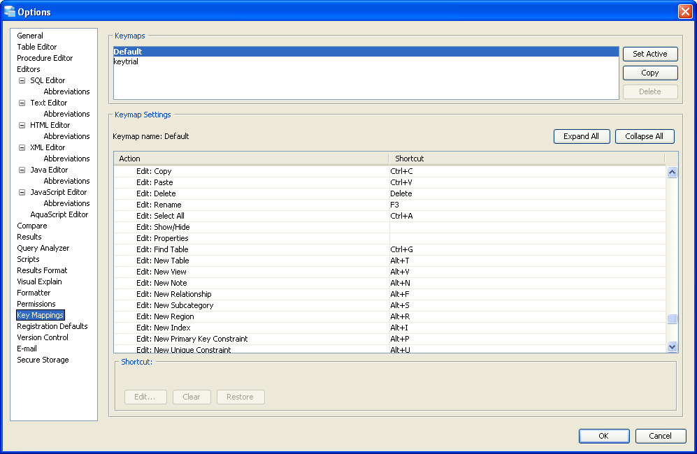 Key Mapping Options Key Mappings - The Key Mapping Options allows you to configure new key mapping profiles with new key bindings. This allows you to configure any keystroke to any action. The Key Mapping Options allow creating custom keymaps by copying existing keymaps, then configuring individual shortcut key bindings within a custom keymap. All custom keymaps may be edited, renamed and deleted. It is possible to add alternate keybinding shortcuts within a custom keymap for the same action. There are two built-in keymaps which cannot be renamed, edited or deleted, but may be copied as the foundation for new custom keymaps: