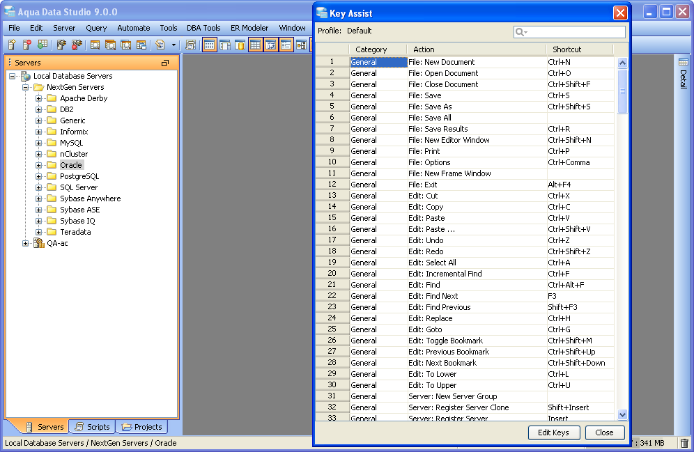 Key Assist - (Ctrl+Shift+L) The Key Mapping Assistant allows a user to quickly look up an action and find the corresponding key binding. Application - Keymappings - Default Application - Keymappings - Emacs