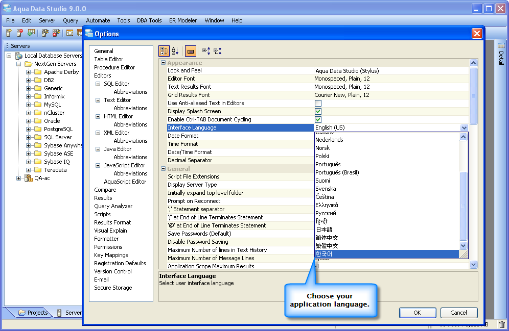 Aqua Data Studio supports the world's 21 most widely spoken languages, which include English, Polish, Norwegian, Dutch, Swedish, Czech, Danish, Finnish, Greek, Hindi, Spanish, French, Portuguese, Portuguese (Brazil), Italian, German, Russian, Korean, Chinese (Traditional), Chinese (Simplified) and Japanese.